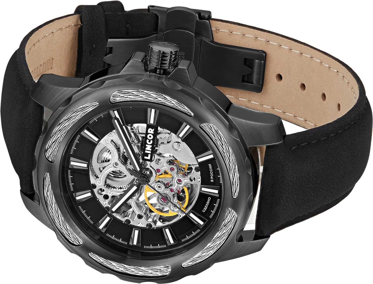 Мужские скелетонизированные механические часы в круглом корпусе. Запас хода до 35 часов. Возможность ручного завода. Циферблат с накладными метками в виде штрихов защищен прочным сапфировым стелом. Стрелки и метки с люминесцентным покрытием, которое светится в темноте после непродолжительной зарядки на свету. Безель украшен декоративным тросом. Заводная головка с защитой. Прозрачная задняя крышка. Ремешок из алькантары с раскладывающейся застежкой.