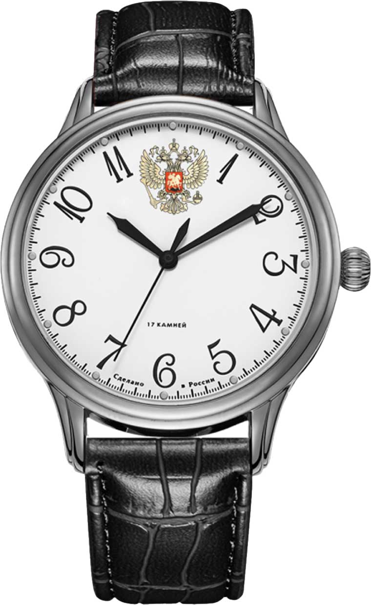 Классические часы понравятся любителям стильных и практичных аксессуаров. Мужские часы с круглым корпусом. В механизме 17 камней. Запас хода 35 часов. Циферблат с метками в виде арабских цифр. Отметка 12 выполнена в виде герба Российской Федерации. Ремешок с классической застежкой.