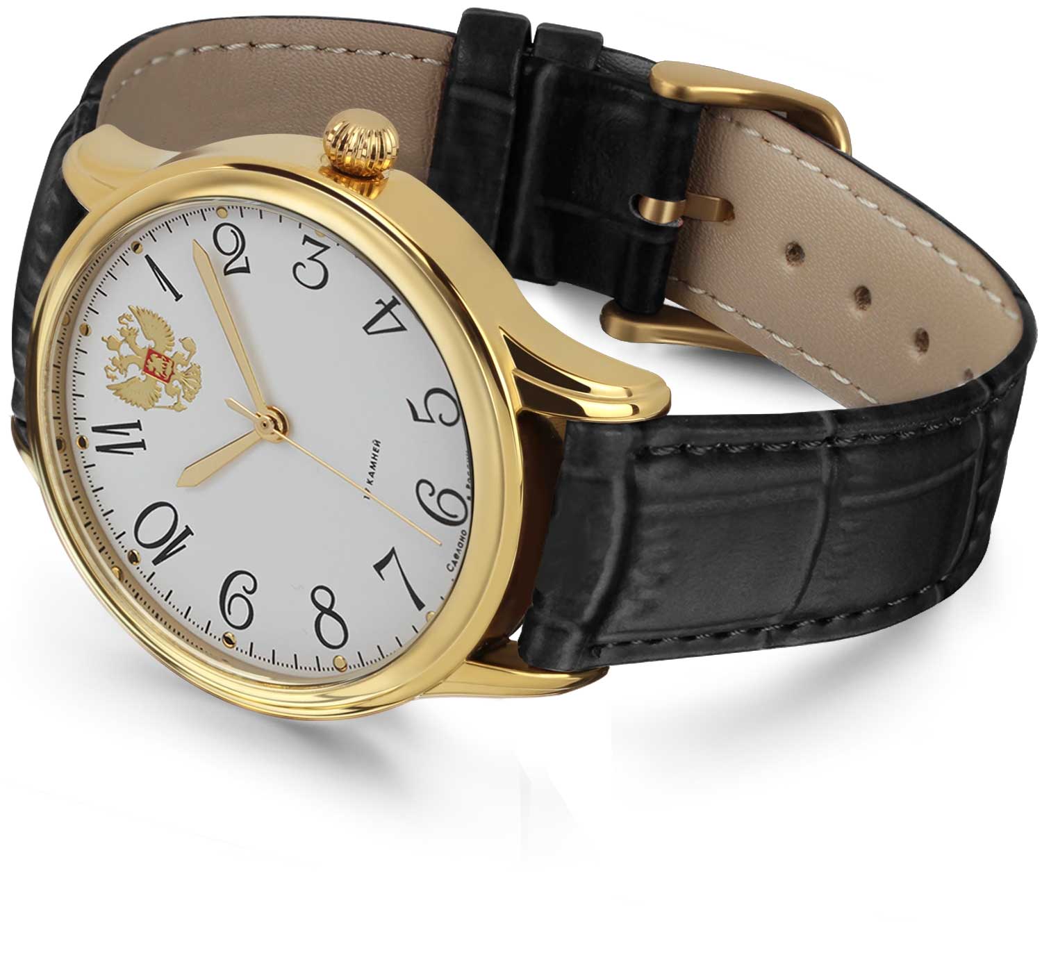 Классические часы понравятся любителям стильных и практичных аксессуаров. Мужские часы с круглым корпусом. В механизме 17 камней. Запас хода 35 часов. Циферблат с метками в виде арабских цифр. Отметка 12 выполнена в виде герба Российской Федерации. Рифленая заводная головка. Ремешок с классической застежкой.