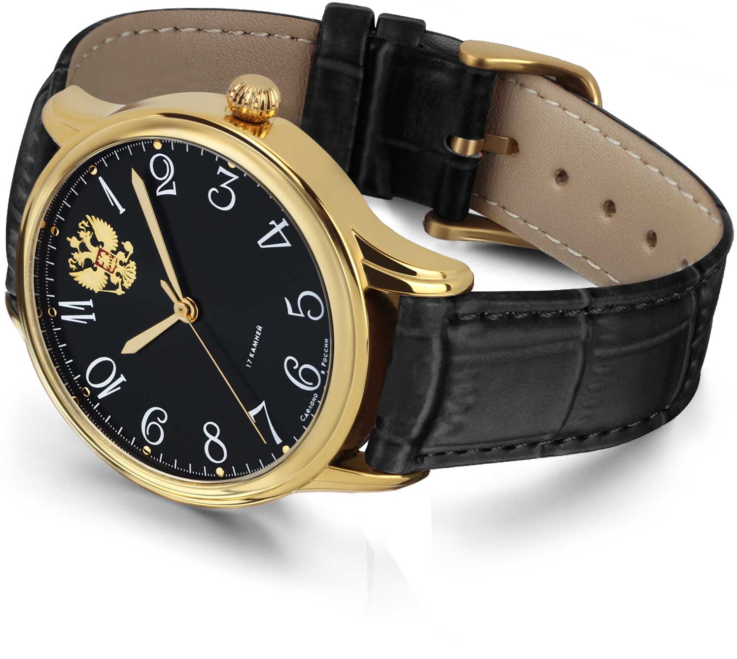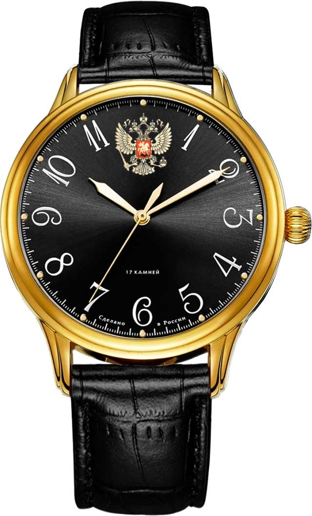 Классические часы понравятся любителям стильных и практичных аксессуаров. Мужские часы с круглым корпусом. В механизме 17 камней. Запас хода 35 часов. Циферблат с метками в виде арабских цифр. Отметка 12 выполнена в виде герба Российской Федерации. Рифленая заводная головка. Ремешок с классической застежкой.