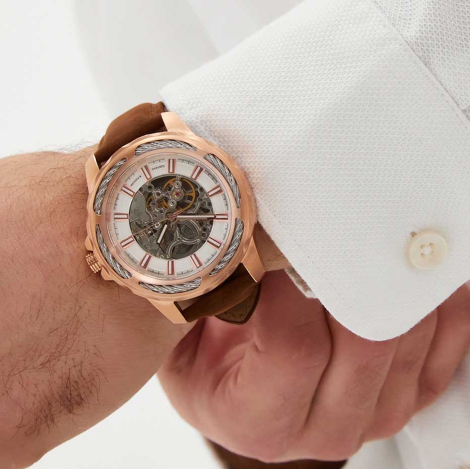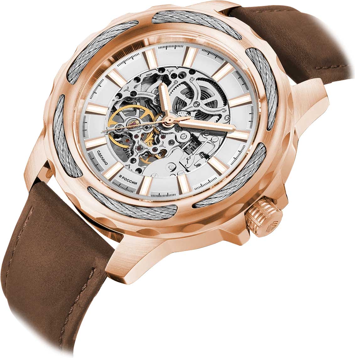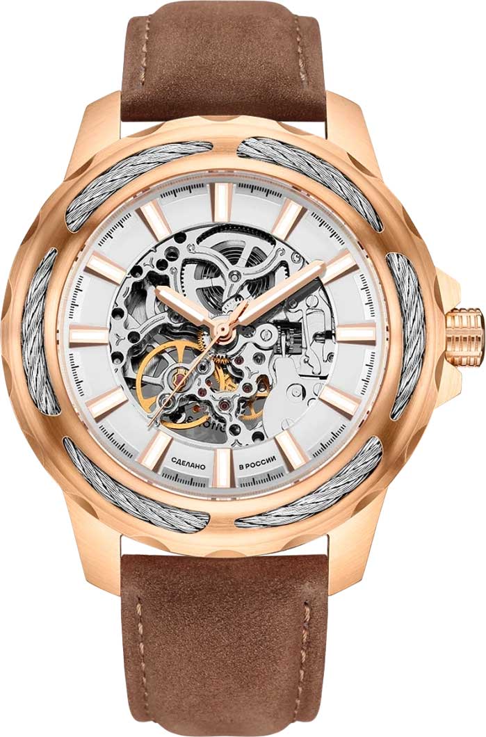 Скелетоны на кожаном ремешке — идеальный аксессуар для образа элегантного мужчины. Скелетонизированные часы. Возможность ручного завода. Метки в виде штрихов. Безель украшен декоративным тросом. Рифленая заводная головка с защитой. Ремешок с классической застежкой.