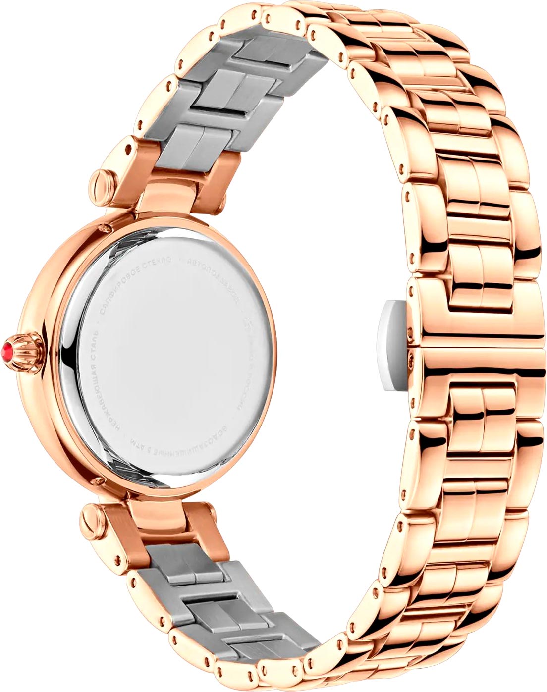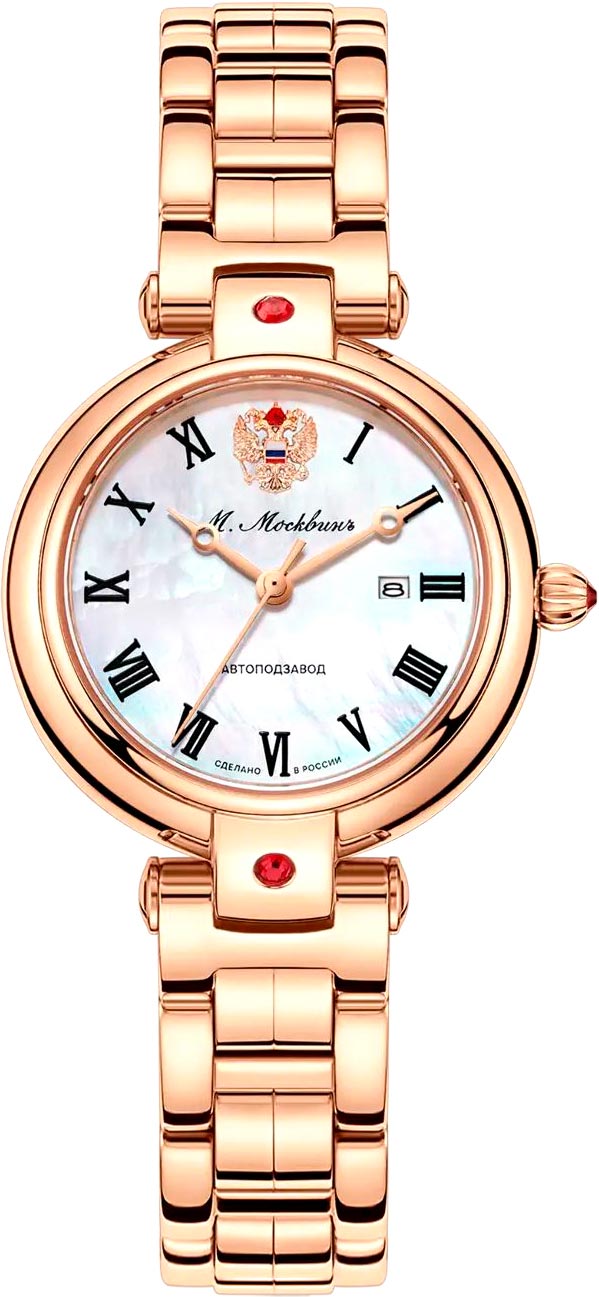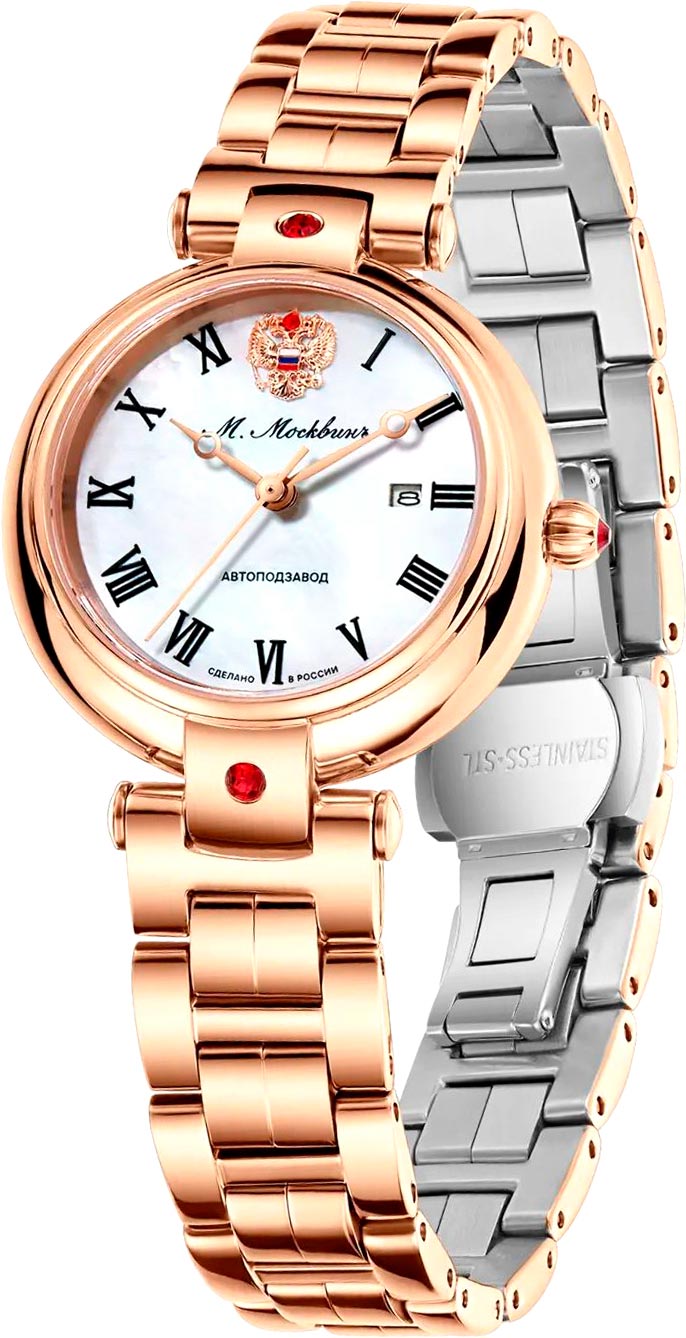 Женские наручные механические часы. В механизме 21 камень, частота 28800 полуколебаний в час. Запас хода 40 часов. Круглый стальной корпус. Перламутровый циферблат украшен эмблемой с гербом России и фирменным знаком бренда.