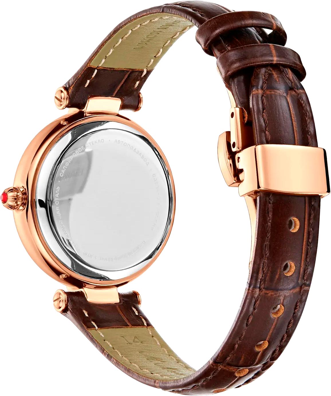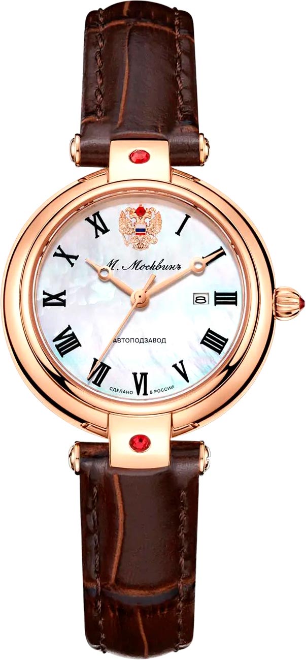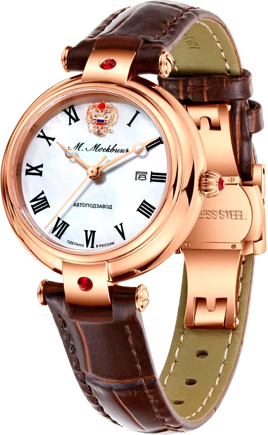 Женские наручные механические часы. В механизме 21 камень, частота 28800 полуколебаний в час. Запас хода 40 часов. Круглый стальной корпус. Перламутровый циферблат украшен эмблемой с гербом России и фирменным знаком бренда.
