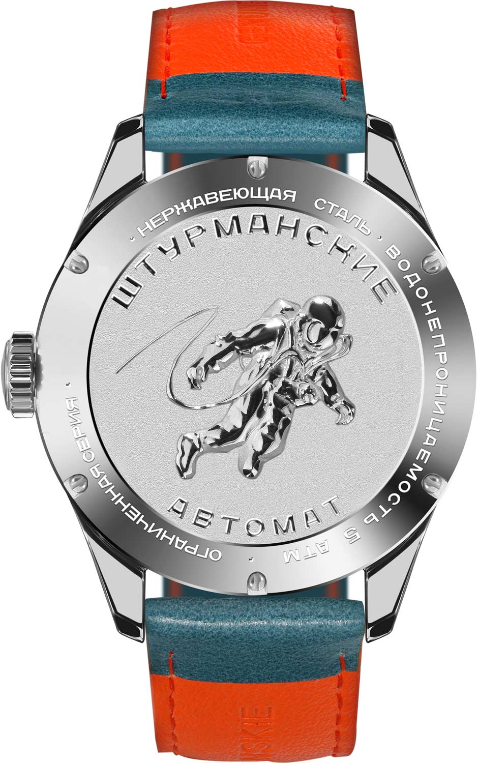 Рифленая заводная головка. Индивидуальная нумерация. Задняя крышка украшена барельефом с изображением космонавта в открытом космосе, созданным по мотивам картины Алексея Леонова. Крепится на 6-ти винтах. Удобный кожаный ремешок с контрастной строчкой.