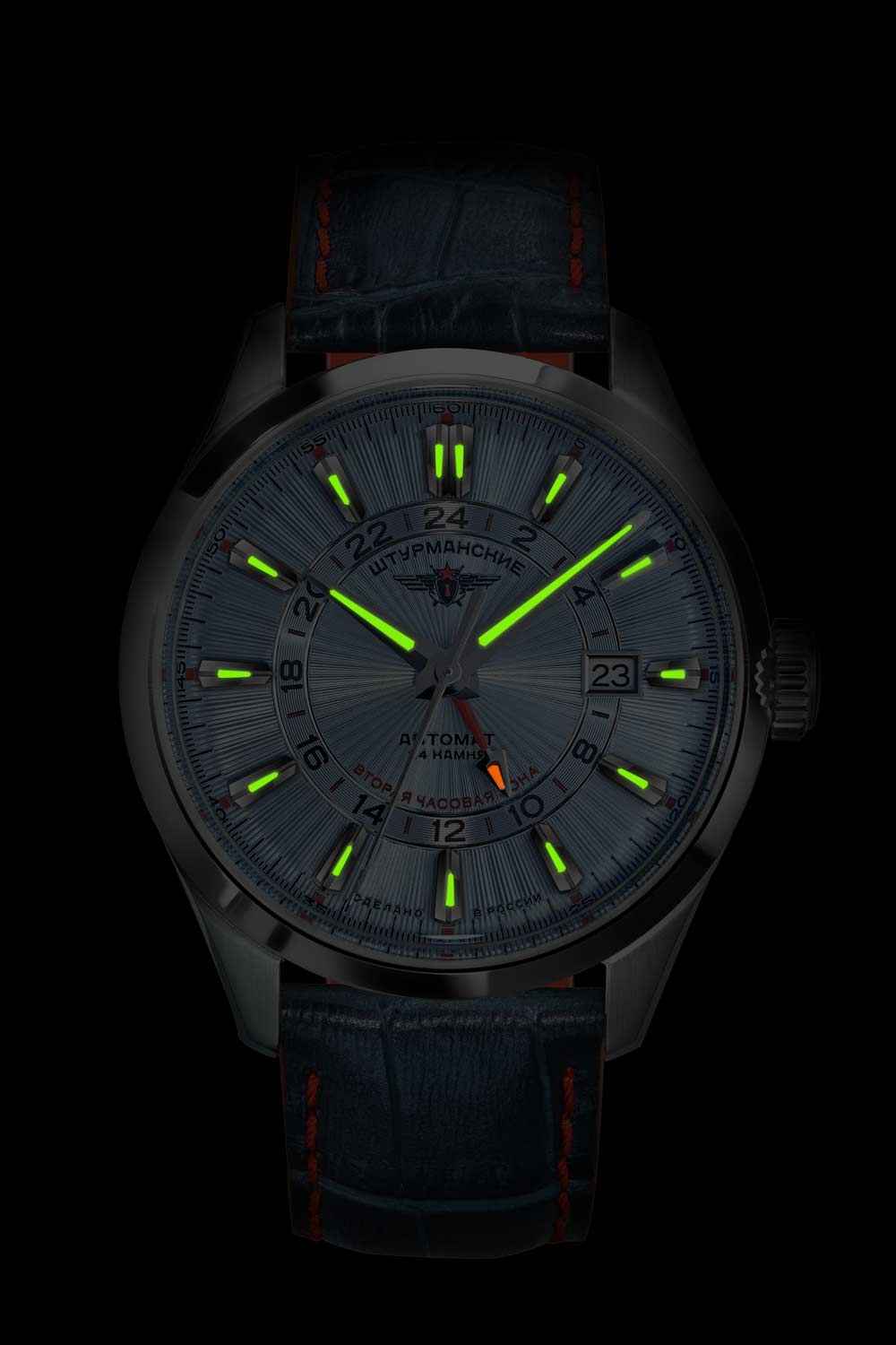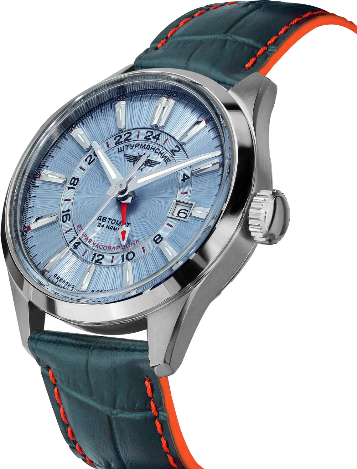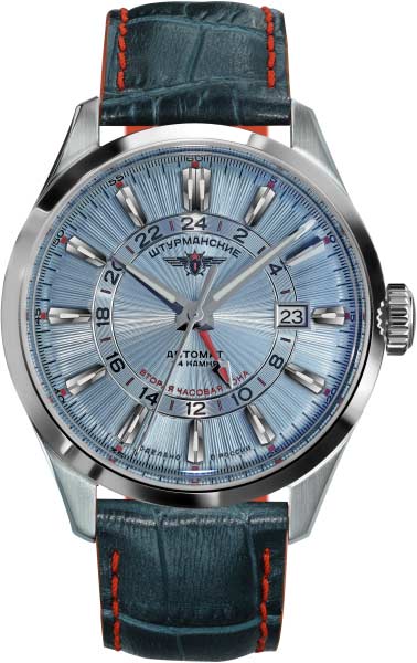 Мужские автоматические часы. Лимитированная серия — 3000 экземпляров. 12-ти и 24-х часовой формат времени. В механизме 24 камня. Запас хода 41 час. Гильошированный циферблат выполнен по технологии Sunray (солнечные лучи). Накладные метки в виде штрихов сложной формы. Окошко даты в накладной рамке находится в положении 3 часа.