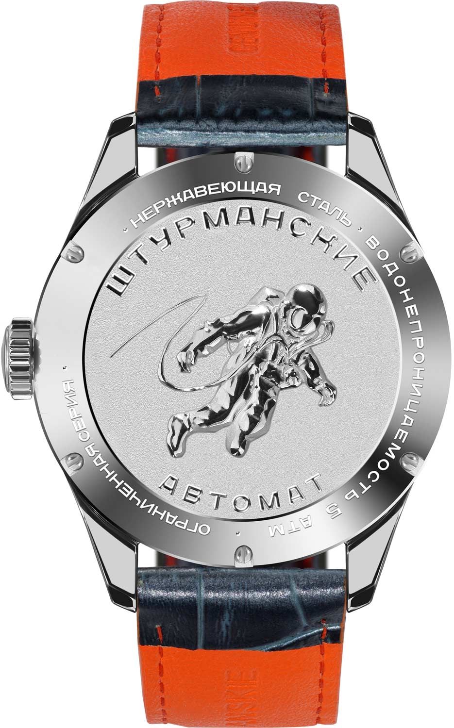 Рифленая заводная головка. Индивидуальная нумерация. Задняя крышка украшена барельефом с изображением космонавта в открытом космосе, созданным по мотивам картины Алексея Леонова. Крепится на 6-ти винтах. Удобный кожаный ремешок с контрастной строчкой.