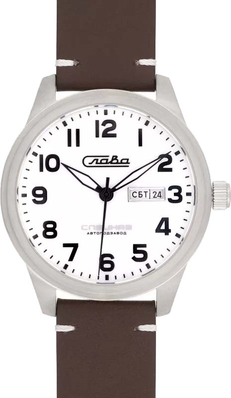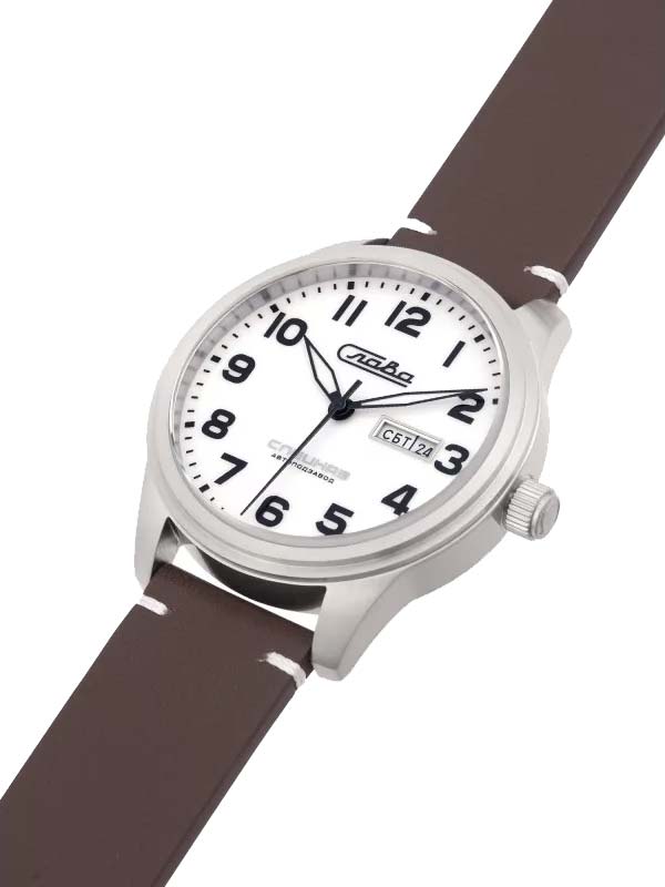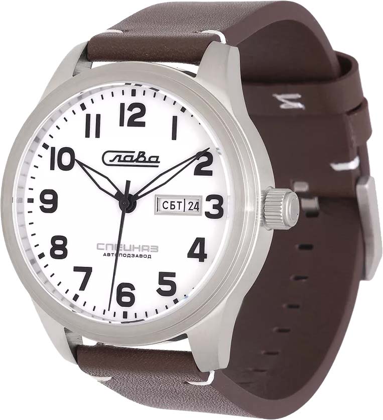 Традиция. Мужские механические часы с автоподзаводом. В механизме 21 камень, частота 21600 полуколебаний в час. Запас хода 42 часа. Круглый стальной корпус. Окошко даты и дня недели в положении 3 часа. Метки в виде арабских цифр. Надпись «Спецназ» и логотип на циферблате. Рифленая заводная головка. Удобный ремешок из натуральной кожи с классической застежкой.