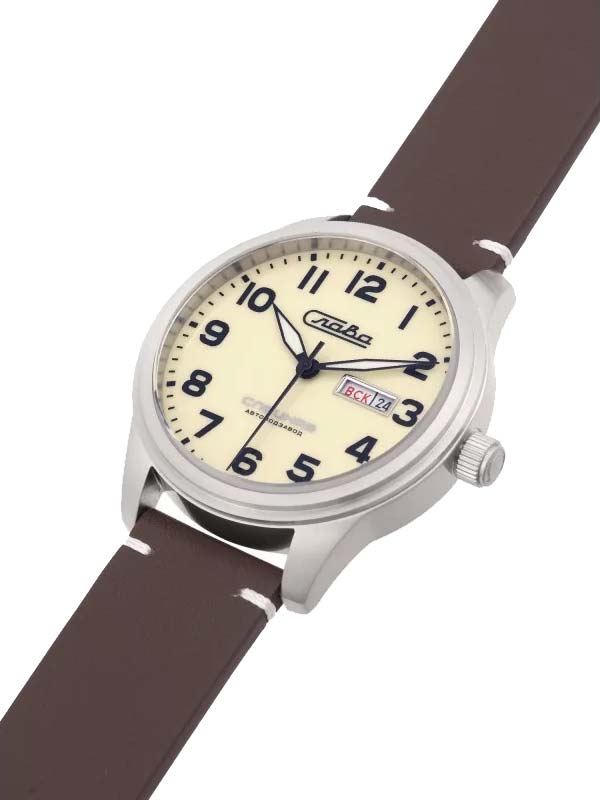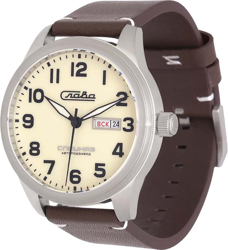Традиция. Мужские механические часы с автоподзаводом. В механизме 21 камень, частота 21600 полуколебаний в час. Запас хода 42 часа. Круглый стальной корпус. Окошко даты и дня недели в положении 3 часа. Метки в виде арабских цифр. Надпись «Спецназ» и логотип на циферблате. Рифленая заводная головка. Удобный ремешок из натуральной кожи с классической застежкой.
