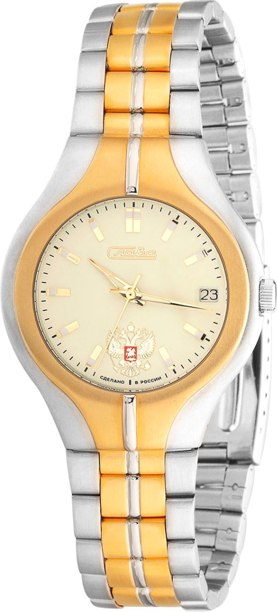 Надежные и удобные часы гармонично вписываются в повседневный стиль одежды. Премьер. Унисекс. В механизме 21 камень, частота 18000 полуколебаний в час. Запас хода 40 часов. Циферблат с окошком даты украшен изображением герба России. Завинчивающаяся прозрачная задняя крышка. Браслет с раскладывающейся застежкой.