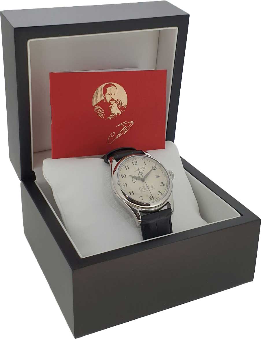 Циферблат украшен автографом писателя и защищен прочным сапфировым стеклом. Метки в виде арабских цифр. Окошко даты находится в положении 3 часа. Рифленая заводная головка. Завинчивающаяся задняя крышка украшена изображением писателя. Удобный кожаный ремешок с классической застежкой. Подарочная упаковка.