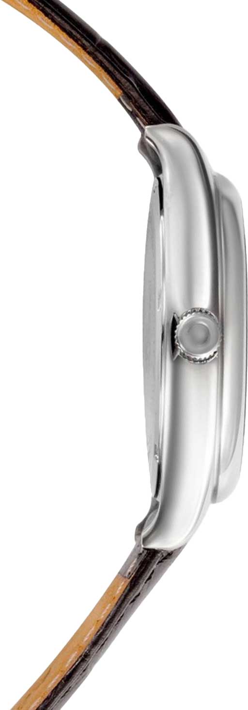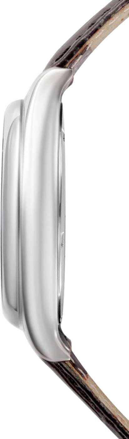 Мужские часы Сенат. В механизме 21 камень, частота 21600 полуколебаний в час. Запас хода 42 часов. Возможность ручного завода. Циферблат с метками в виде арабских цифр. Окошко даты находится в положении 3 часа. Рифленая заводная головка. Кожаный ремешок с классической застежкой.