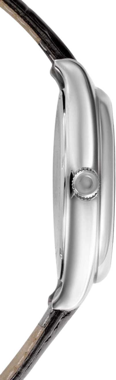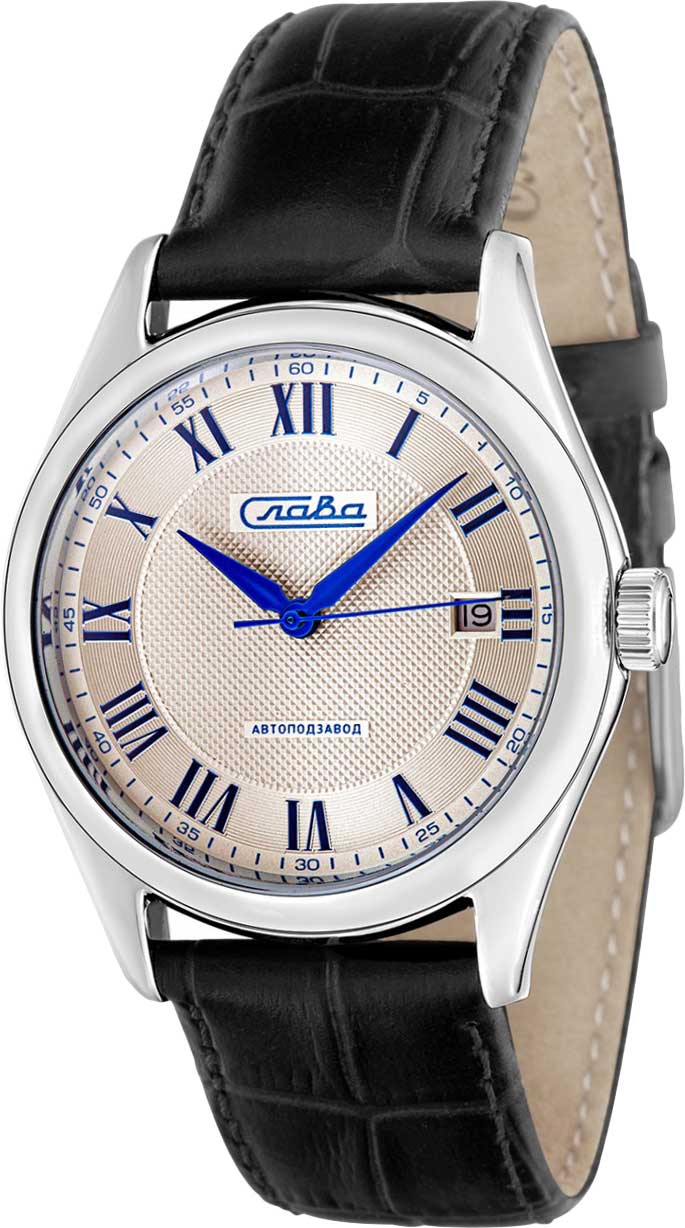 Мужские часы Сенат. В механизме 21 камень, частота 21600 полуколебаний в час. Запас хода 42 часов. Возможность ручного завода. Циферблат с метками в виде римских цифр. Окошко даты находится в положении 3 часа. Рифленая заводная головка. Кожаный ремешок с классической застежкой.