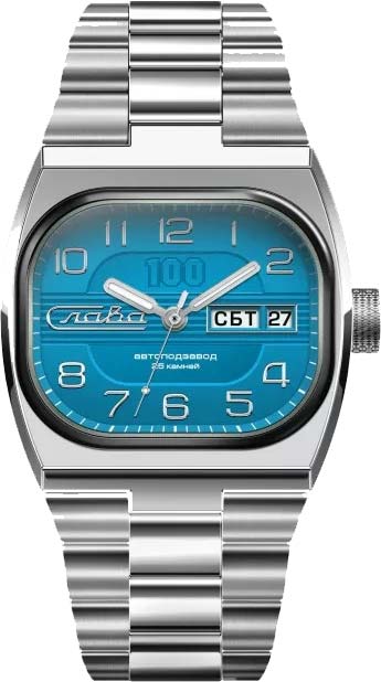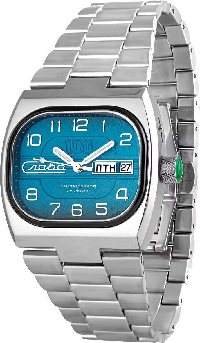 Телевизор. Мужские механические часы с автоподзаводом. Лимитированная серия — 500 экземпляров. В механизме 25 камней. Запас хода 31 час. Прямоугольный корпус. Циферблат с дизайном напоминающим TV экран. Закругленные прямоугольные стрелки в стиле Baton. Метки в виде арабских цифр. Окошко даты и дня недели в положении 3 часа. Рифленая заводная головка. Надежный стальной браслет с раскладывающейся застежкой.