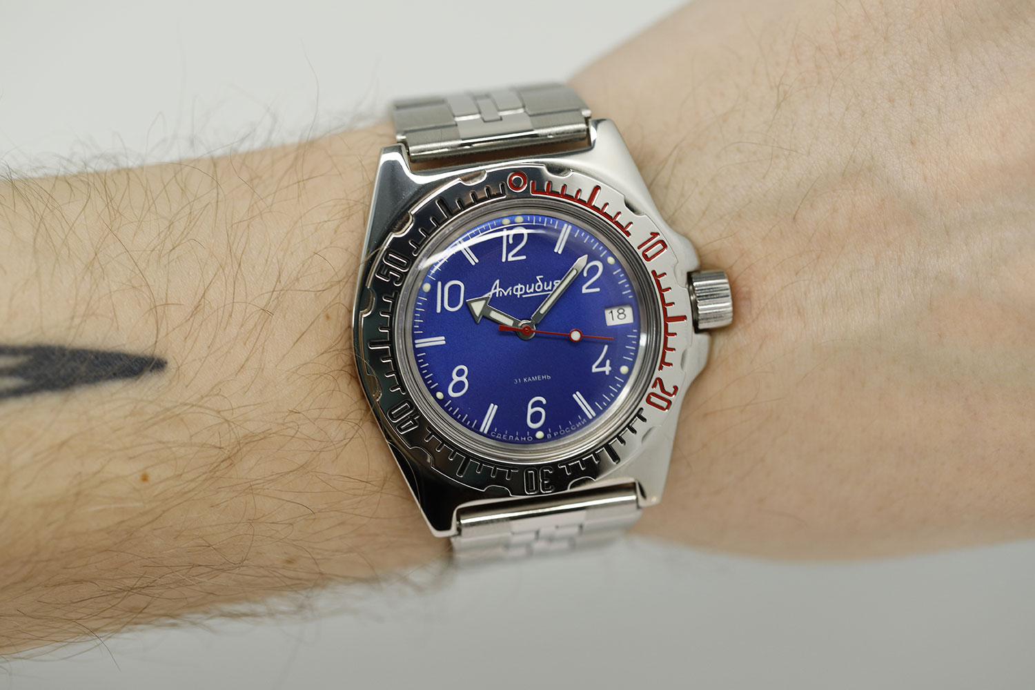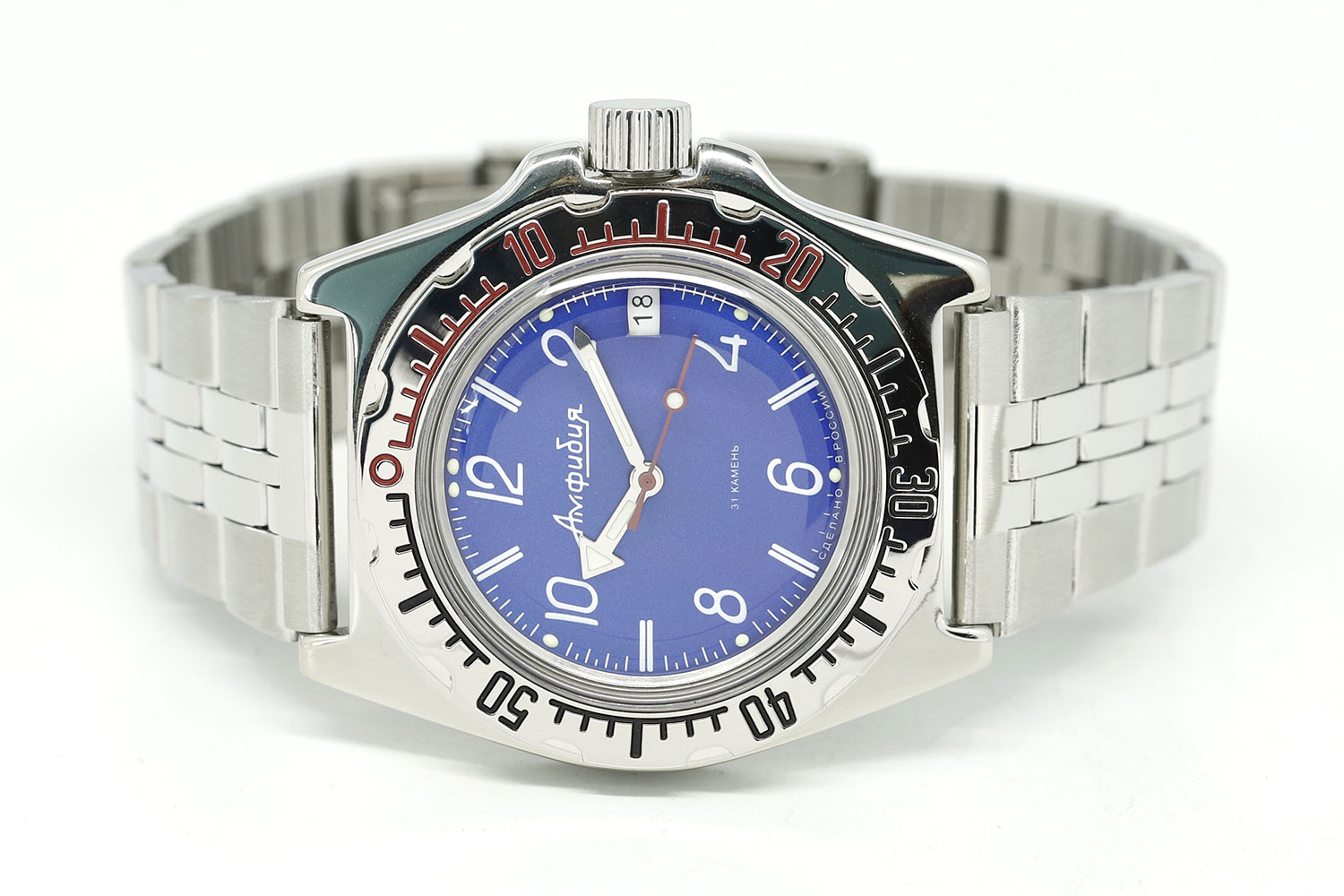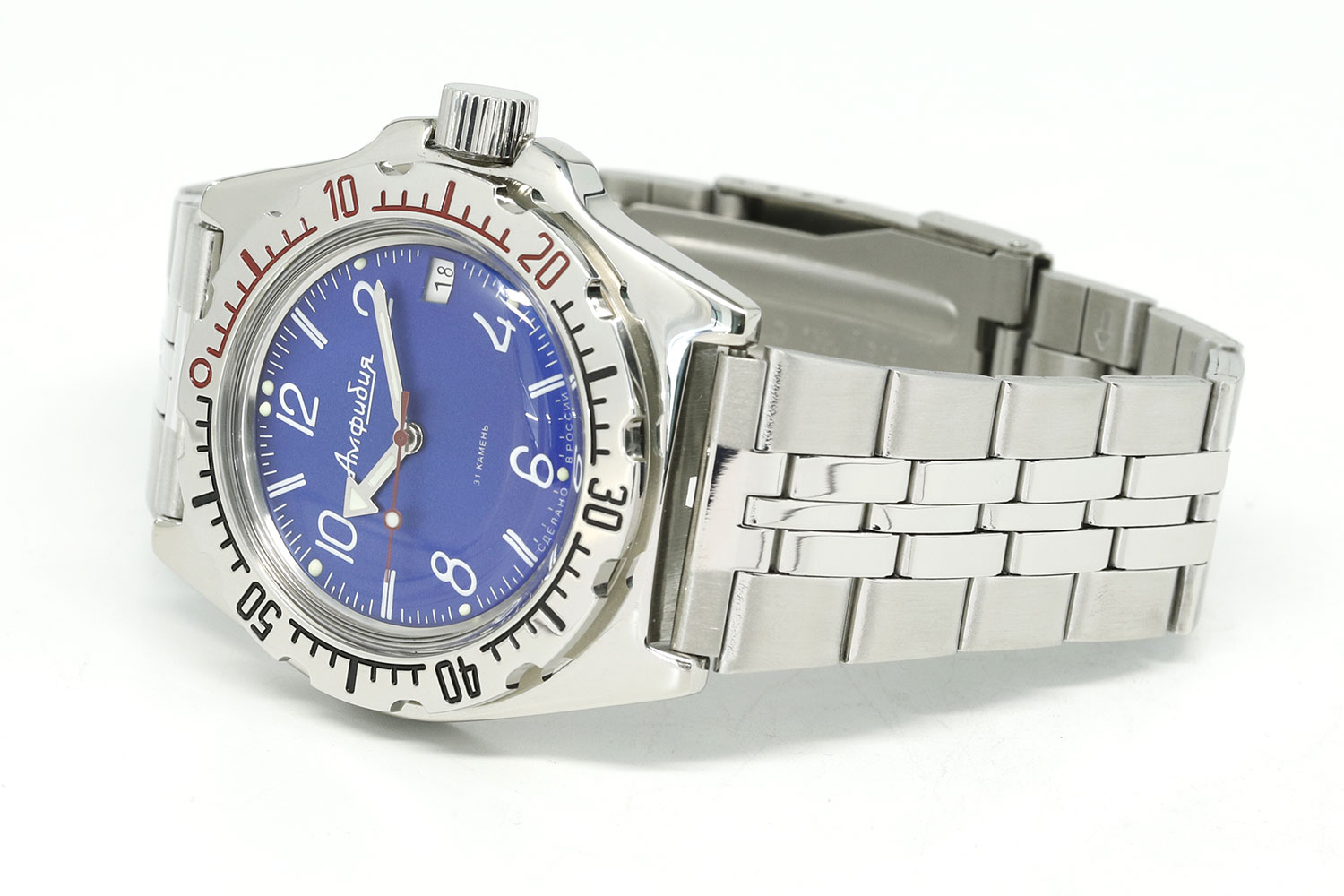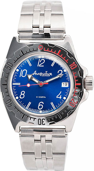 Часы со спортивным дизайном для сильных мужчин. Они не подведут даже в самых экстремальных условиях. Амфибия Классика. В механизме 31 камень, частота 19800 полуколебаний в час. Запас хода 31 час. Противоударное устройство оси баланса. Заводная головка с защитой. Браслет с раскладывающейся застежкой. Производитель оставляет за собой право вносить изменения во внешний вид часов.