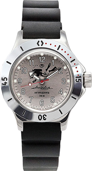 Часы с высокой водозащитой станут лучшим спутником дайвера как в воде, так и на суше. Амфибия Классика. В механизме 31 камень, частота 19800 полуколебаний в час. Запас хода 31 час. Противоударное устройство оси баланса. Заводная головка с защитой. Производитель оставляет за собой право вносить изменения во внешний вид часов.