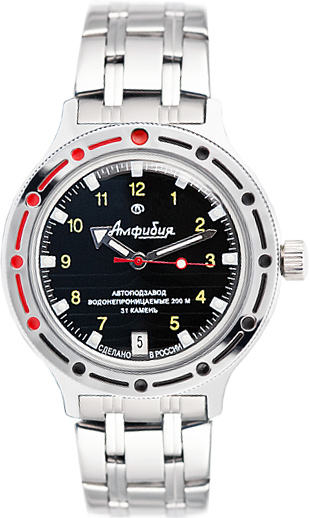 Часы со спортивным дизайном для сильных мужчин. Они не подведут даже в самых экстремальных условиях. Амфибия Классика. В механизме 31 камень, частота 19800 полуколебаний в час. Запас хода 31 час. Противоударное устройство оси баланса. Браслет с раскладывающейся застежкой. Производитель оставляет за собой право вносить изменения во внешний вид часов.