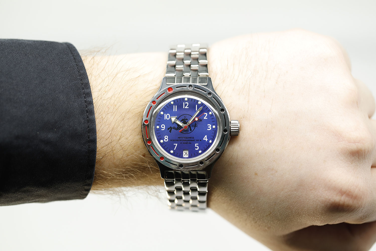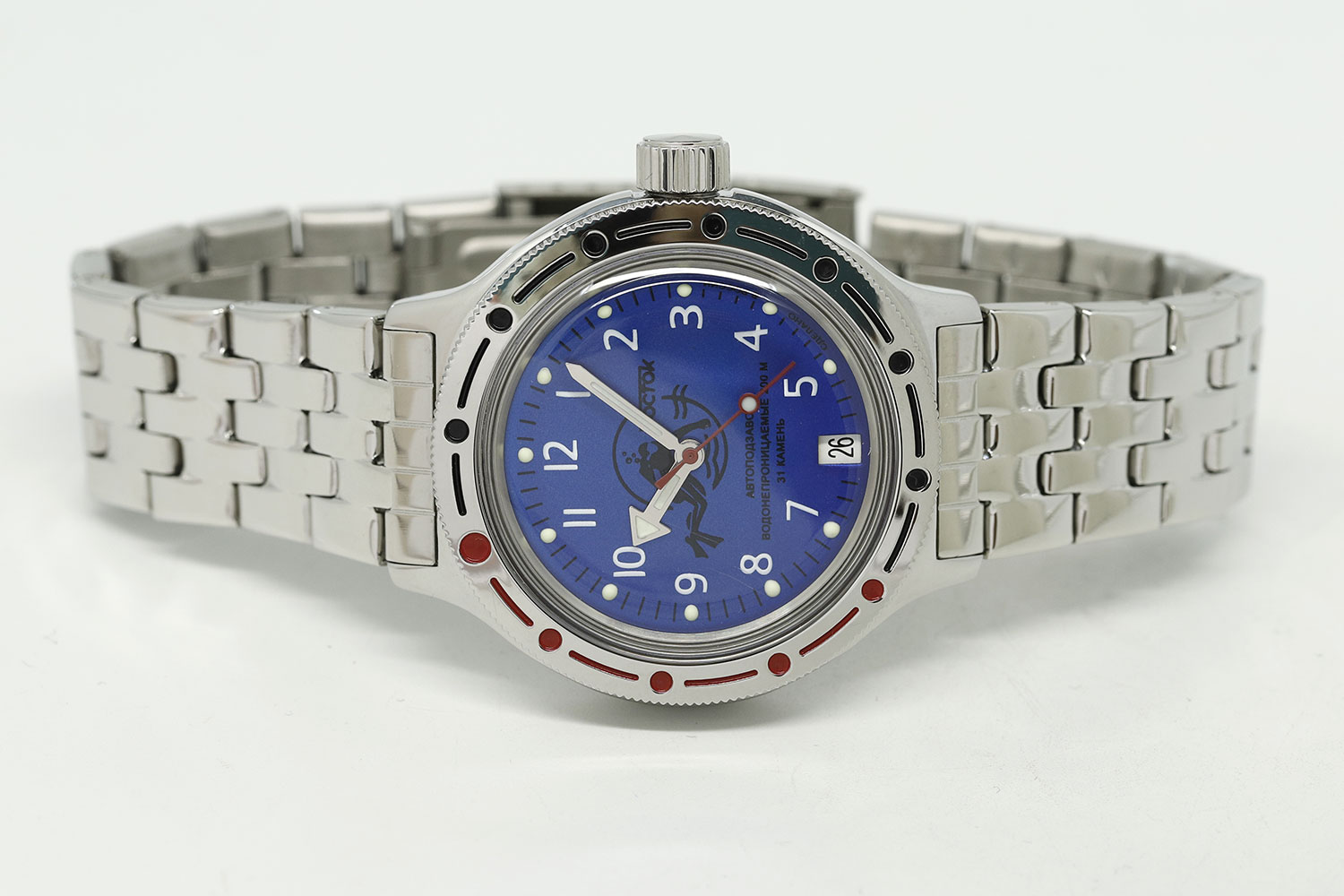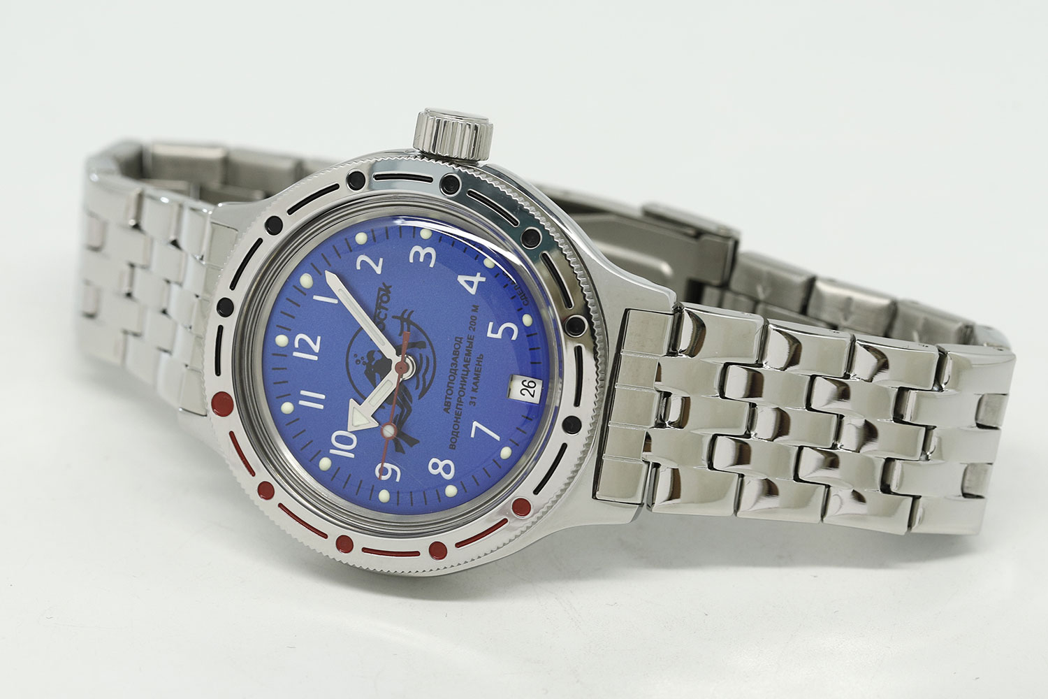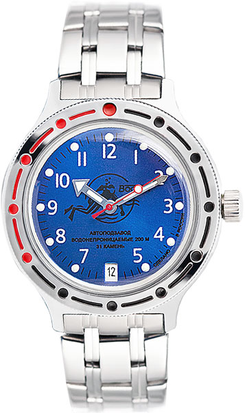 Эти практичные часы великолепно сидят на руке и позволят вам чувствовать себя уверенно в любой обстановке. Амфибия Классика. В механизме 31 камень, частота 19800 полуколебаний в час. Запас хода 31 час. Противоударное устройство оси баланса. Браслет с раскладывающейся застежкой. Производитель оставляет за собой право вносить изменения во внешний вид часов.