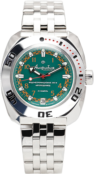 Часы со спортивным дизайном для сильных мужчин. Они не подведут даже в самых экстремальных условиях. Амфибия Классика. В механизме 31 камень, частота 19800 полуколебаний в час. Запас хода 31 час. Противоударное устройство оси баланса. Браслет с раскладывающейся застежкой. Производитель оставляет за собой право вносить изменения во внешний вид часов.