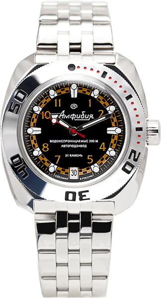 Часы со спортивным дизайном для сильных мужчин. Они не подведут даже в самых экстремальных условиях. Амфибия Классика. В механизме 31 камень, частота 19800 полуколебаний в час. Запас хода 31 час. Противоударное устройство оси баланса. Браслет с раскладывающейся застежкой. Производитель оставляет за собой право вносить изменения во внешний вид часов.