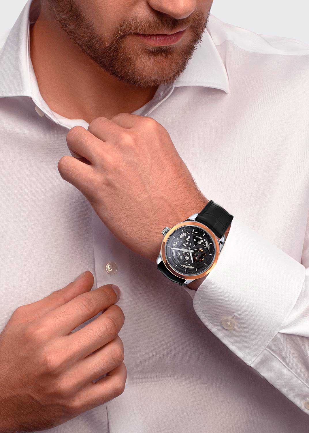 Скелетонизированные мужские часы Ego. Круглый корпус из серебра 925 пробы с гладким накладным безелем из розового золота 585 пробы.
