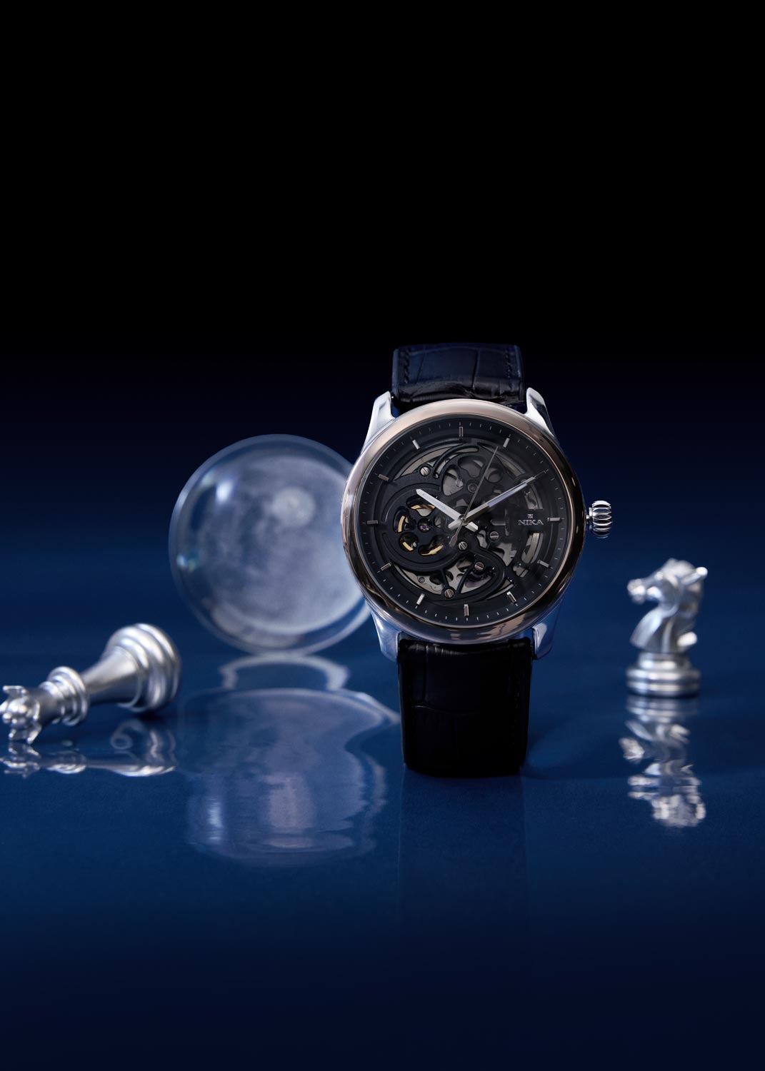 Сквозь циферблат можно разглядеть работу надежного японского механизма. Метки в виде штрихов. Заостренные прямоугольные стрелки в стиле Baton с люминесцентным покрытием, которое светится в темноте после непродолжительной зарядки на свету. Рифленая заводная головка. Удобный ремешок из натуральной кожи с раскладывающейся застежкой.