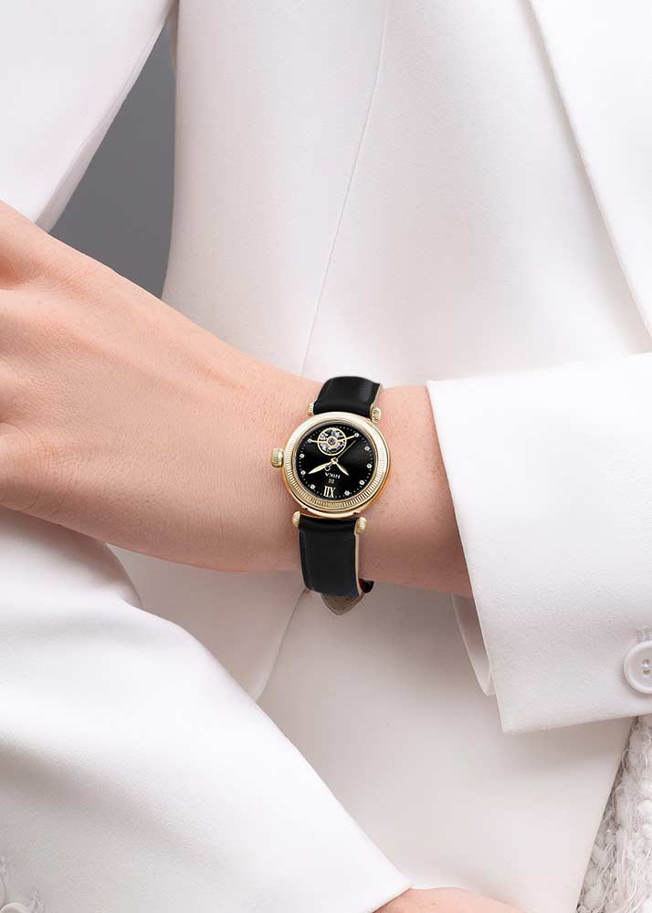 Женские наручные часы. Главная особенность модели — апертура Open Heart, благодаря которой можно увидеть работу японского механизма Miyota 6T28 с автоподзаводом. В механизме 21 камень. Компактный круглый корпус из желтого золота 585 пробы. Циферблат выполнен по технологии Sunray (солнечные лучи). Метки в виде точек и римской цифры XII.