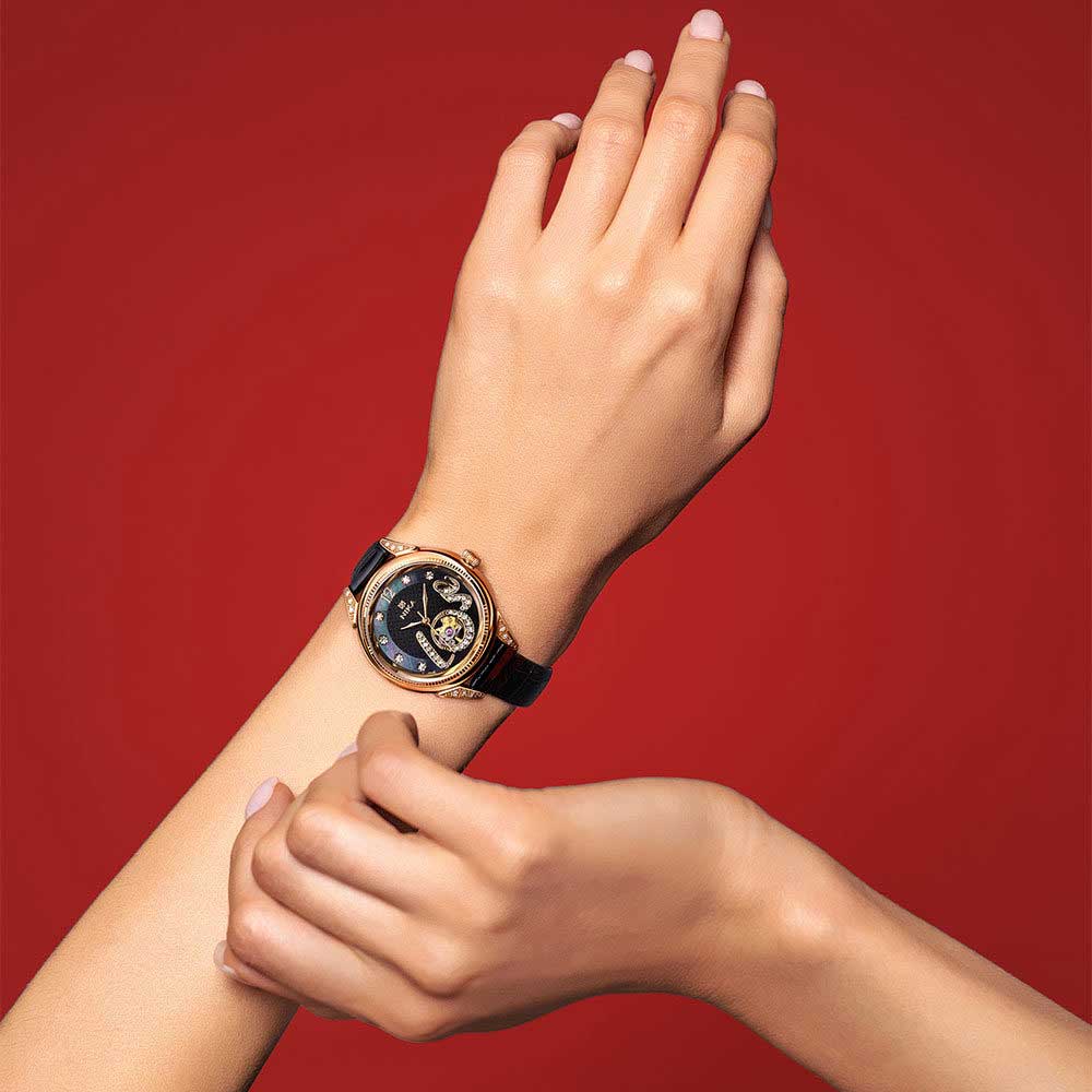 Золотые часы, украшенные ослепительными бриллиантами и кристаллами, станут настоящим эталоном роскоши и безупречности. Celebrity Love. Женские часы с круглым корпусом из розового золота. В механизме 24 камня, 28800 полуколебаний в час. Запас хода 42 часа. Сквозь прозрачное окошко на циферблате можно наблюдать за работой механизма часов. Метки в виде точек и арабской цифры 12. Рифленая заводная головка. Безель с алмазной гранью. Прозрачная задняя крышка. Ремешок с классической застежкой. Производитель оставляет за собой право вносить изменения во внешний вид часов.
