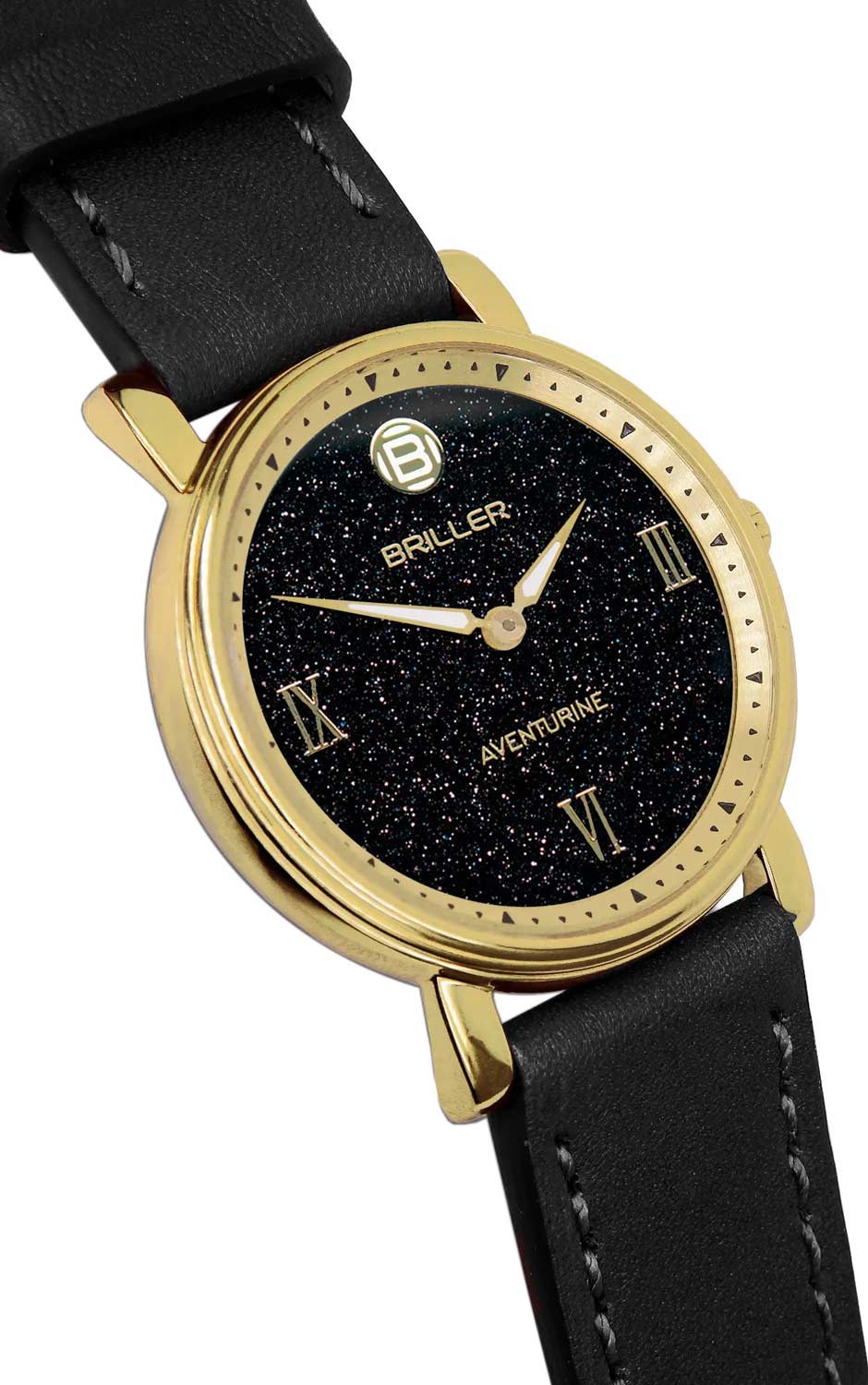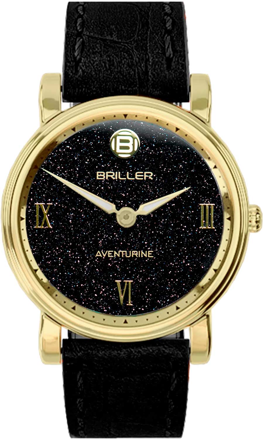 Женские наручные часы Aventurine. Круглый стальной корпус с ионно-плазменным напылением. Авантюриновый циферблат защищен прочным сферическим сапфировым стеклом. Метки в виде римских цифр. Секундная стрелка отсутствует.