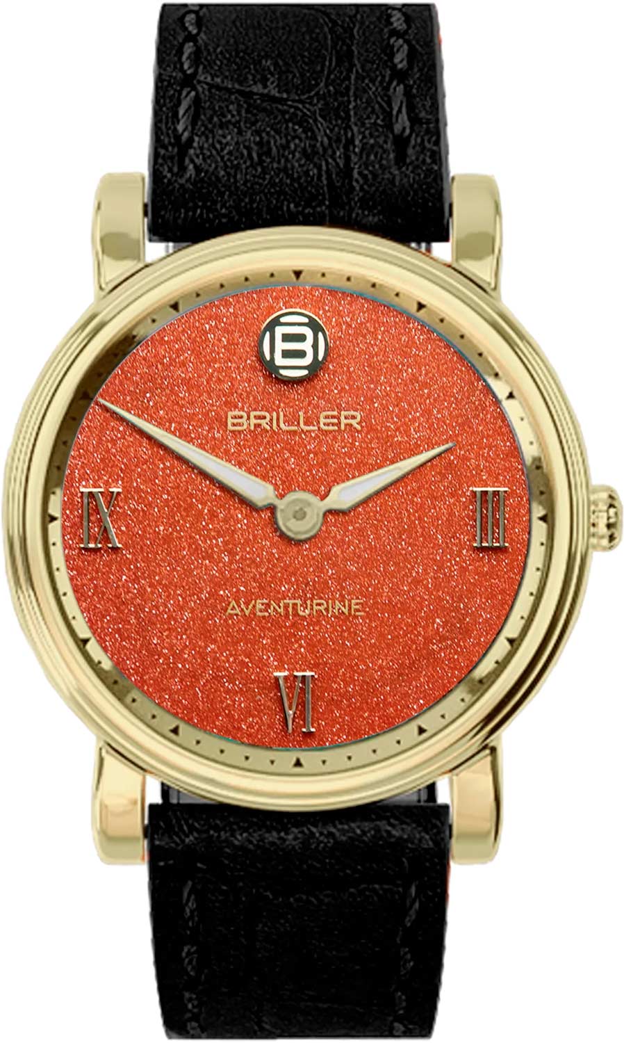 Женские наручные часы Aventurine. Круглый стальной корпус с ионно-плазменным напылением. Авантюриновый циферблат защищен прочным сферическим сапфировым стеклом. Метки в виде римских цифр. Секундная стрелка отсутствует.