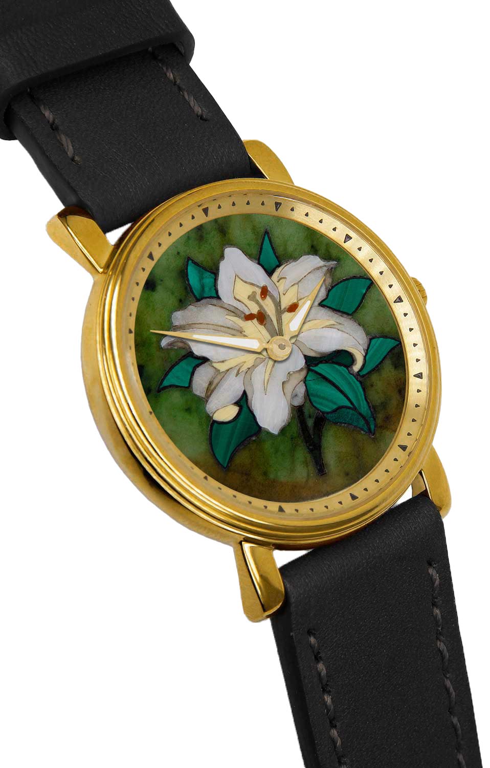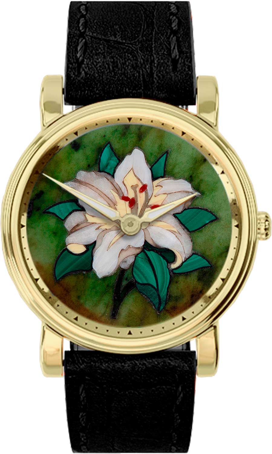Наручные кварцевые часы Лилия с круглым стальным корпусом. На циферблате флорентийская мозаика ручной работы с изображением цветка. Мозаика выполнена из полудрагоценных и поделочных камней. При создании мозаики использовались камни: зеленый нефрит, ксонотлит, малахит.