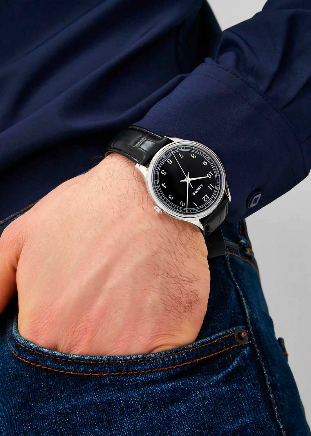Тонкие прямоугольные стрелки. Стальная задняя крышка крепится на 4-х винтах. Рифленая заводная головка в форме луковицы.