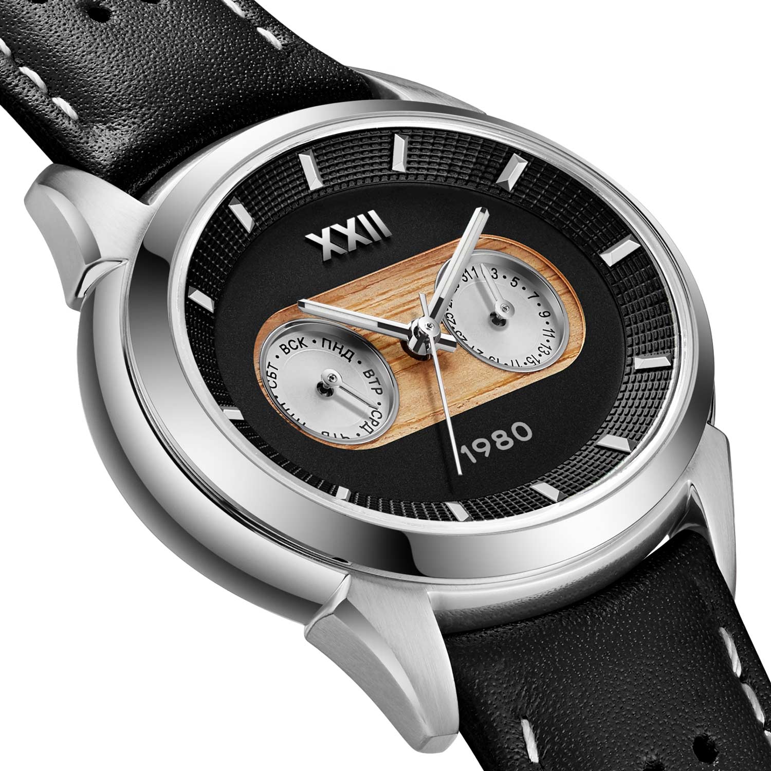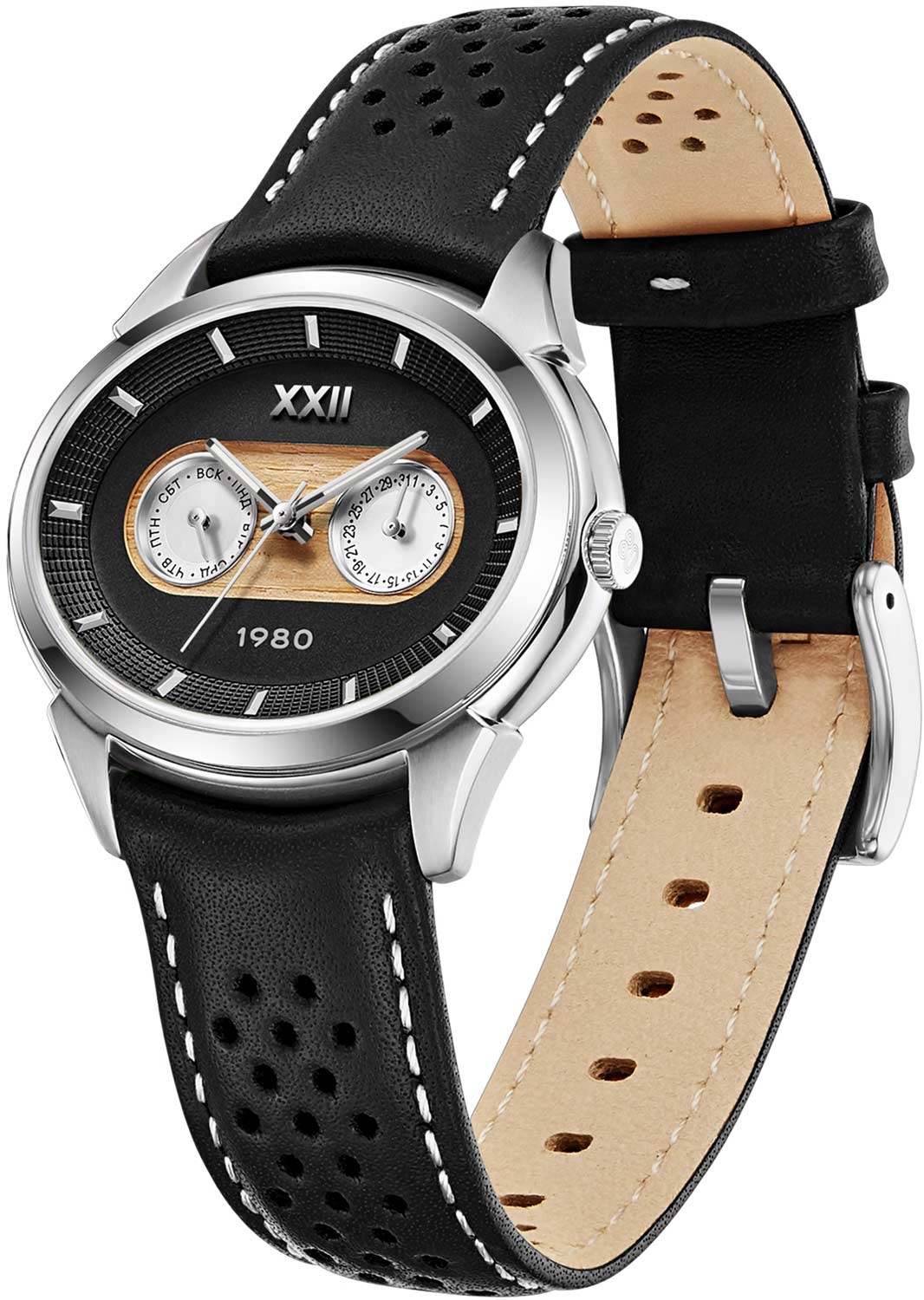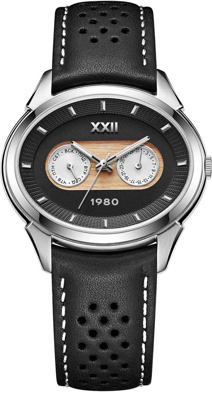Метки в виде штрихов. Дата и день недели вынесены на отдельные малые циферблаты. Рифленая заводная головка с гравировкой ''80''.