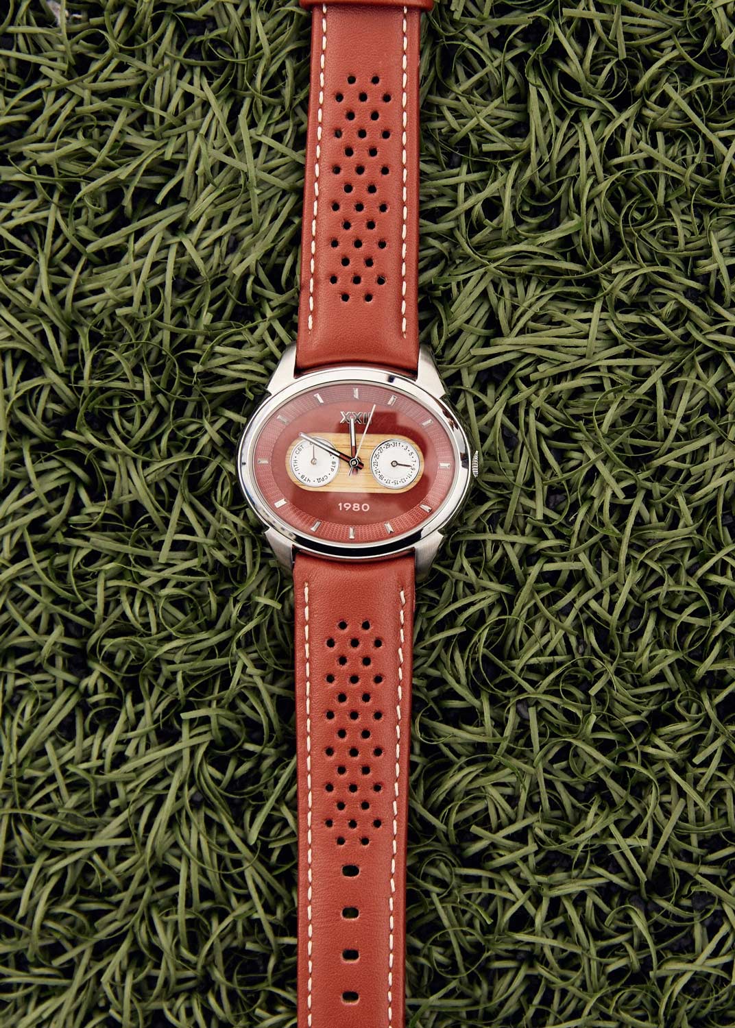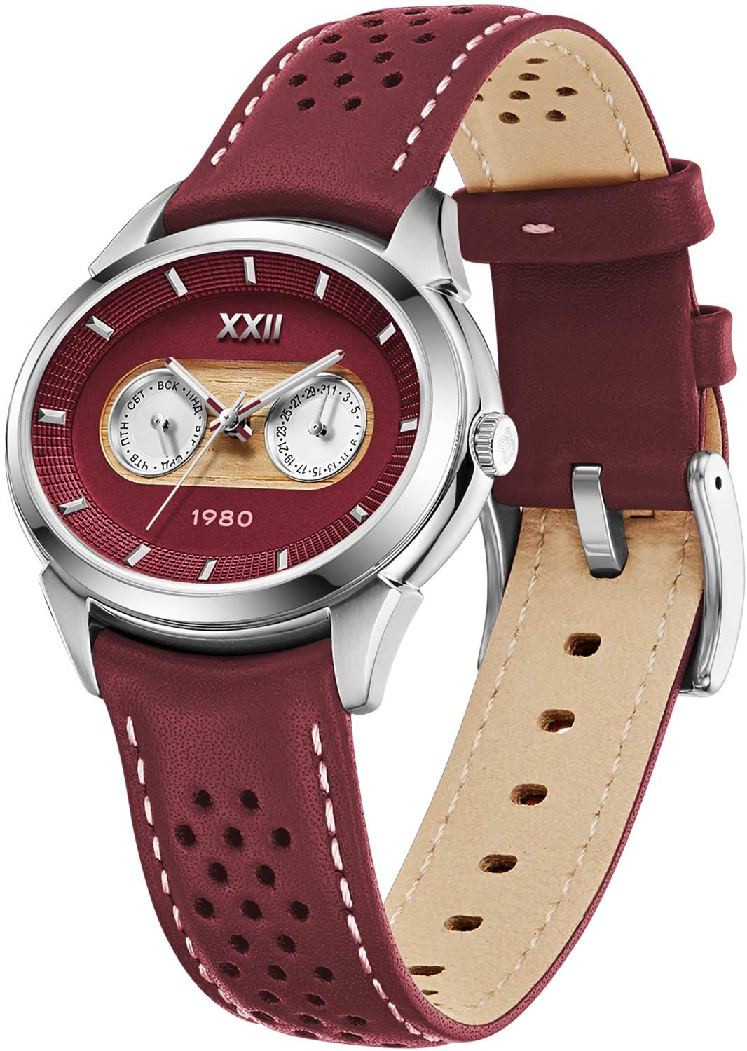 Кварцевые наручные часы. Овальный стальной корпус напоминает изгибы велотрека. Циферблат со скошенными гранями, воссоздающими узнаваемый силуэт переполненных трибун, защищен прочным сапфировым стеклом. Центральная вставка из натурального дерева как отсылка к деревянному покрытию олимпийских спортивных объектов.