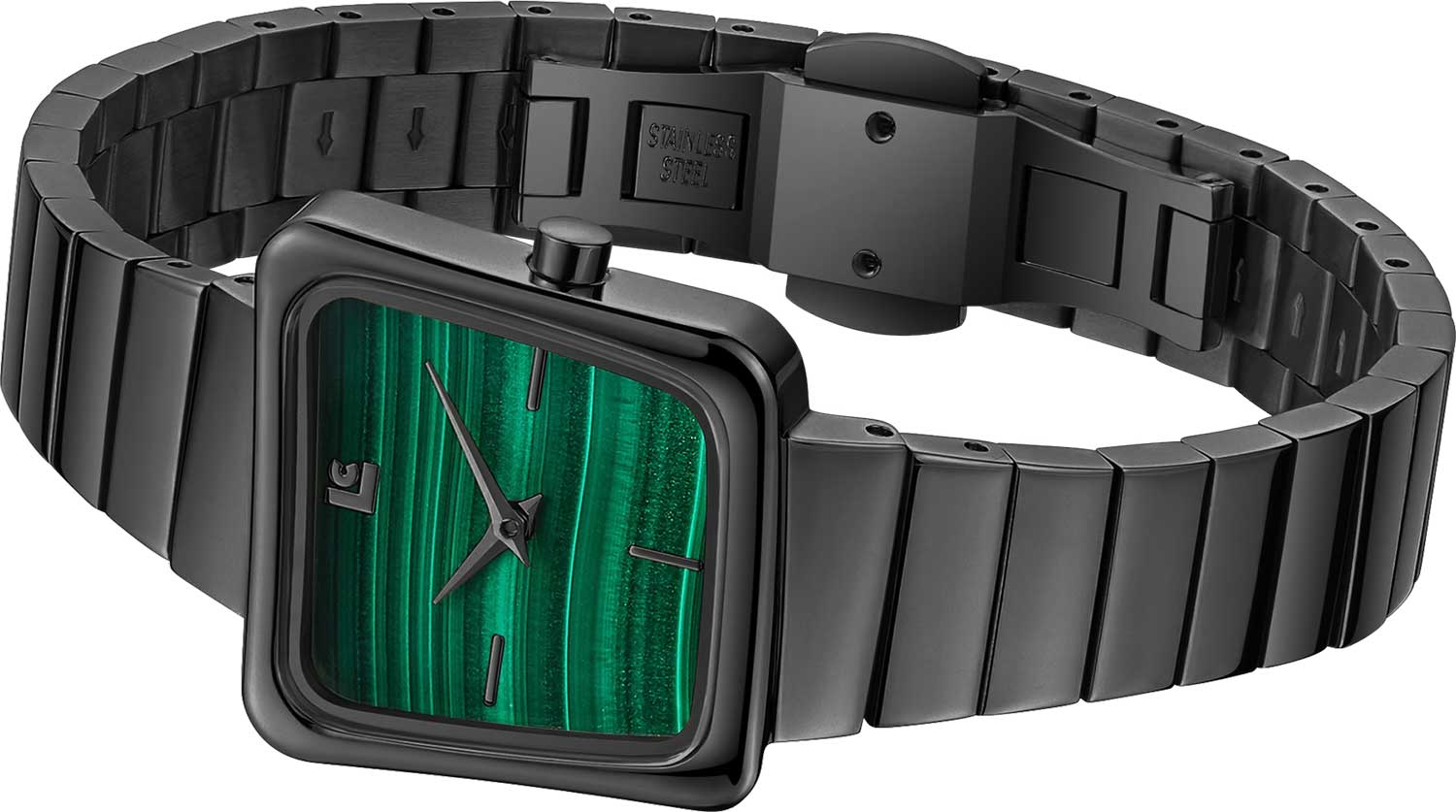 Женские часы с необычным стальным корпусом. Циферблат выполнен из малахита и защищен прочным сапфировым стеклом. Метки в виде штрихов. Задняя крышка крепится на 4-х винтах. Браслет с раскладывающейся застежкой.