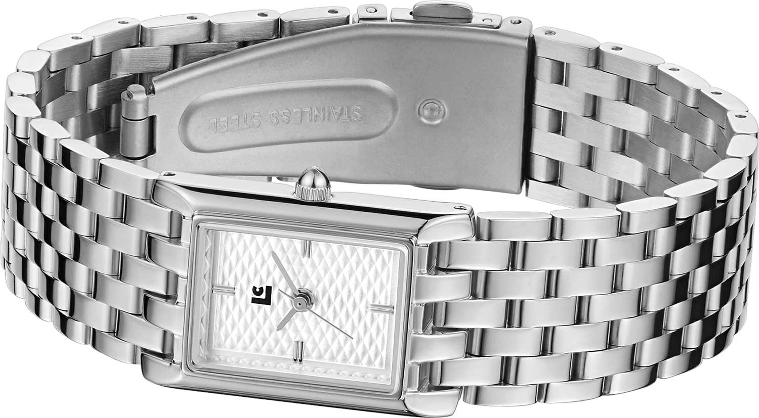 Ультратонкие женские часы Uni. Стальной прямоугольный корпус. Гильошированный циферблат с метками в виде штрихов. Рифленая заводная головка. Стальной браслет с раскладывающейся застежкой.