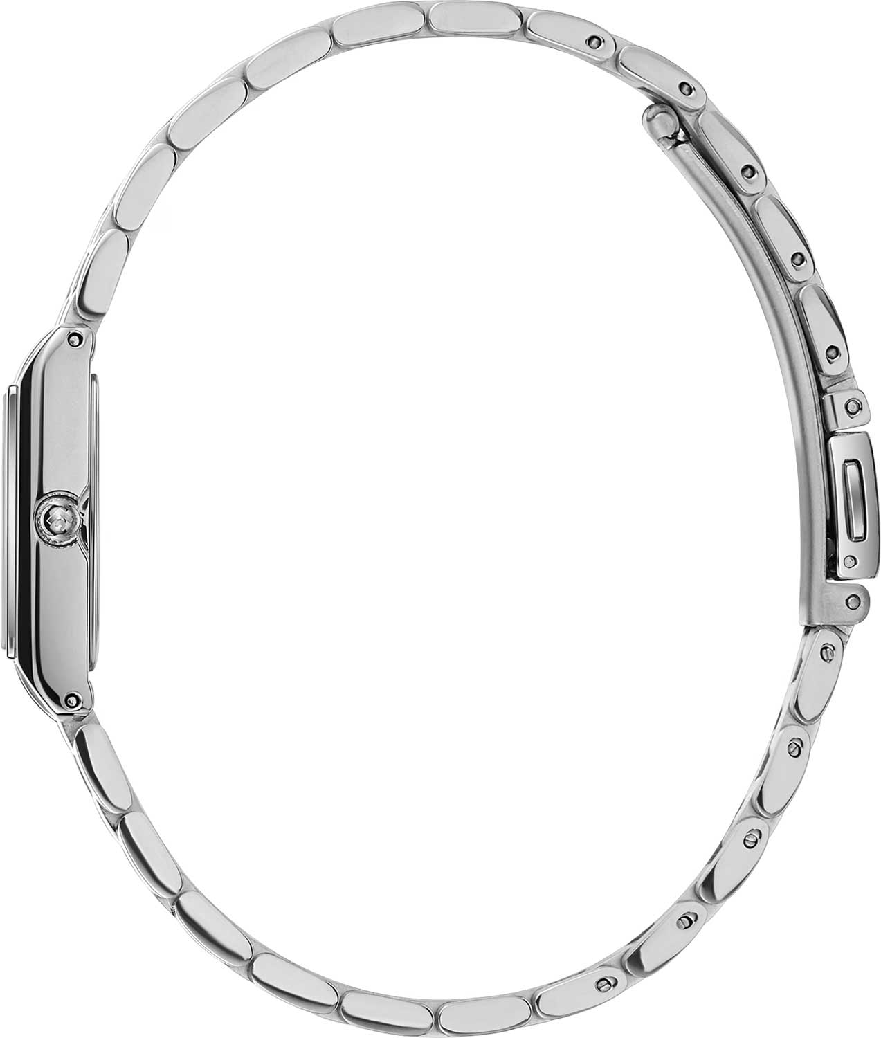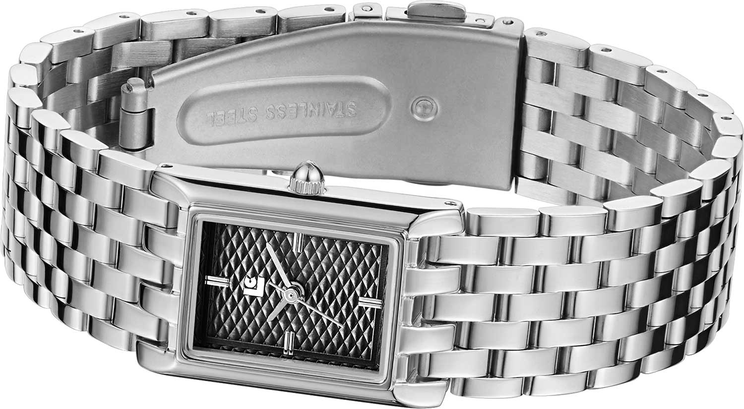 Ультратонкие женские часы Uni. Стальной прямоугольный корпус. Гильошированный циферблат с метками в виде штрихов. Рифленая заводная головка. Стальной браслет с раскладывающейся застежкой.