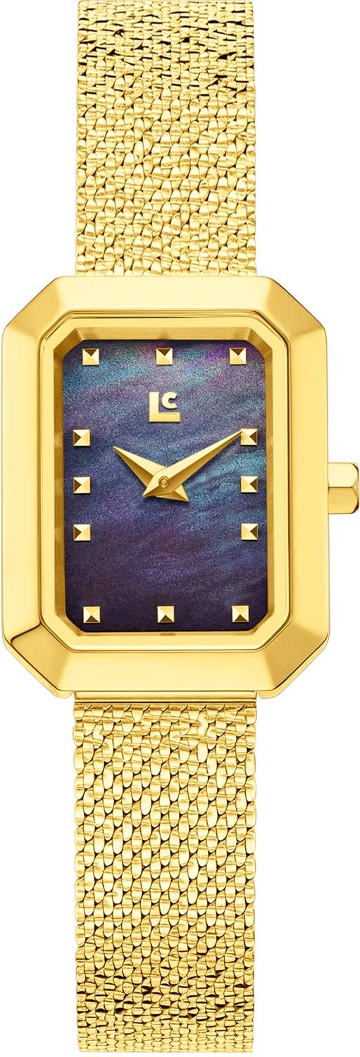 Женские наручные часы. Стальной корпус имеет восьмиугольную форму октагона. Перламутровый циферблат защищен минеральным стеклом. Метки в виде точек с фианитами.