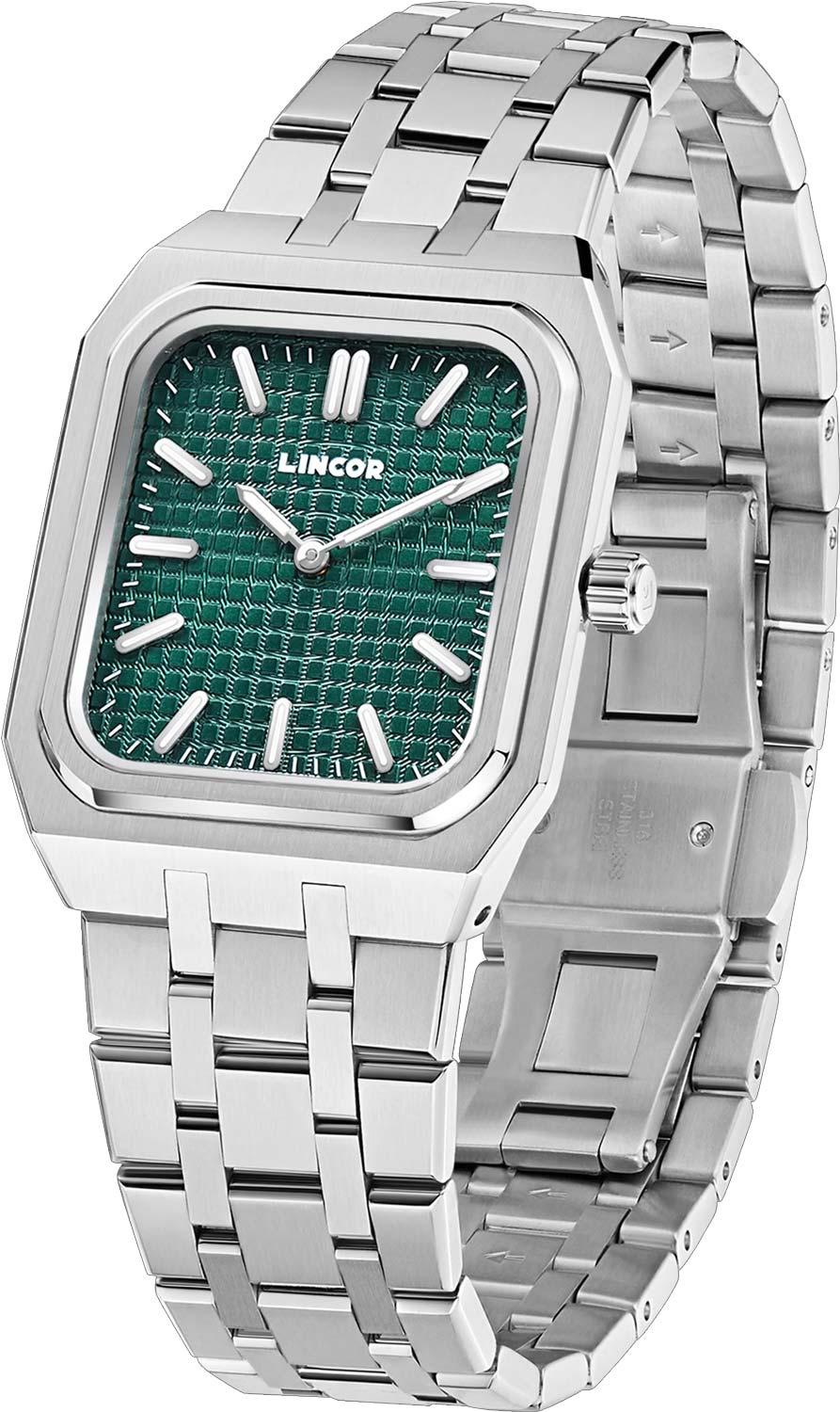 Мужские наручные часы. Стальной корпус с циферблатом в форме квадрата. Циферблат с сетчатым дизайном и накладными метками в виде штрихов. Заостренные прямоугольные стрелки в стиле Baton. Рифленая заводная головка. Стальная задняя крышка крепится на 4-х винтах. Надежный стальной браслет с раскладывающейся застежкой.