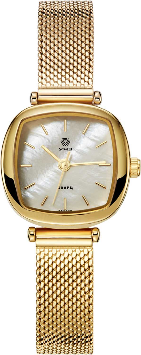 Женские часы с японским механизмом. Перламутровый циферблат с метками в виде штрихов. Рифленая заводная головка. Браслет миланского плетения.
