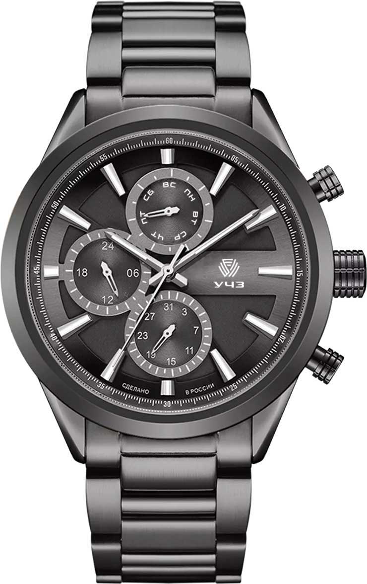 Мужские кварцевые часы в круглом корпусе. Двухуровневый циферблат с метками в виде штрихов выполнен по технологии Sunray (солнечные лучи). 12-ти и 24-х часовой формат времени. Дата и день недели вынесены на отдельные циферблаты. Браслет с раскладывающейся застежкой.