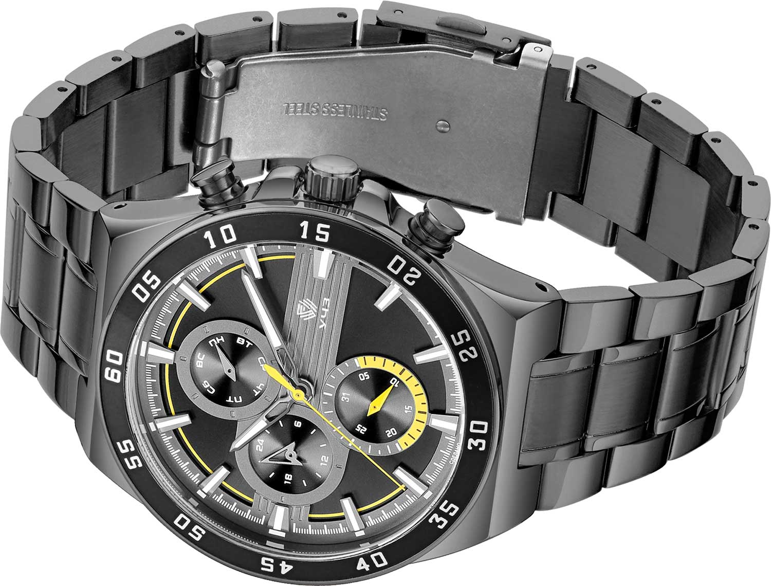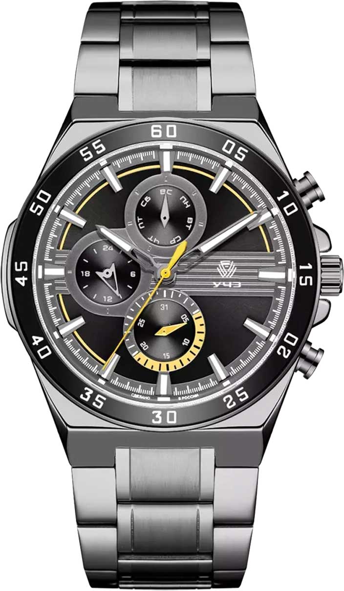 Стильный и функциональный аксессуар на каждый день с которым ваше время будет под контролем. Мужские кварцевые часы в круглом корпусе. Циферблат с метками в виде штрихов выполнен по технологии Sunray (солнечные лучи). 12-ти и 24-х часовой формат времени, дата и день недели вынесены на отдельные циферблаты. Заводная головка с защитой. Браслет с раскладывающейся застежкой.