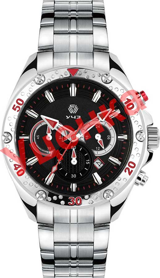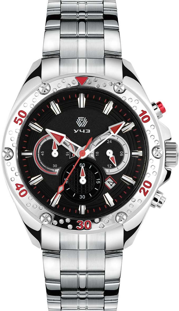 Часы-хронограф с секундомером. 12-ти и 24-х часовой формат времени. Циферблат с метками в виде штрихов. Окошко даты находится в положении между отметками 4 и 5 часов. Безель украшен декоративными болтами. Заводная головка с защитой. Браслет с раскладывающейся застежкой.