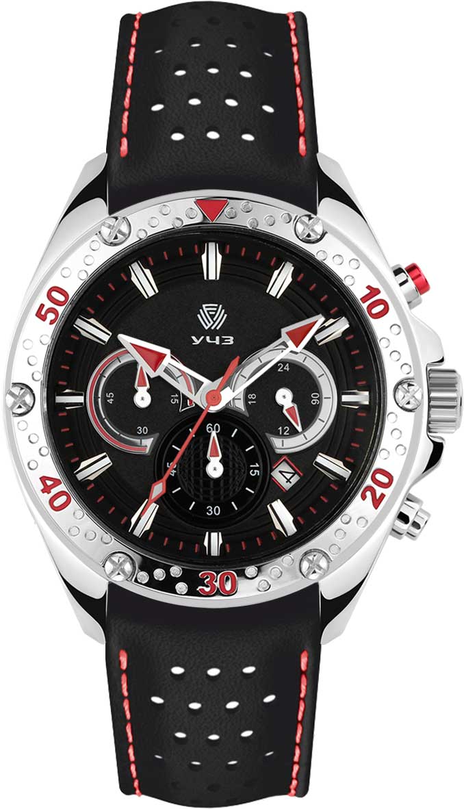 Мужской хронограф в крупном круглом корпусе для тех, кто предпочитает динамичный и активный образ жизни. Часы-хронограф с секундомером. 12-ти и 24-х часовой формат времени. Циферблат с метками в виде штрихов. Окошко даты находится в положении между отметками 4 и 5 часов. Безель украшен декоративными болтами. Заводная головка с защитой. Ремешок с красной строчкой и классической застежкой.