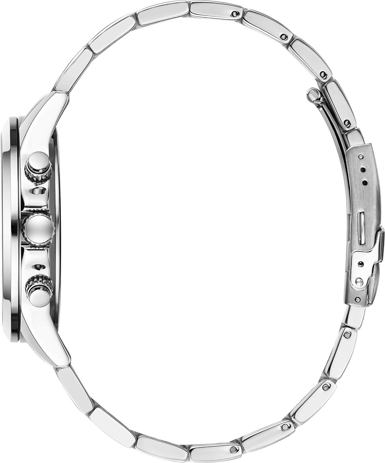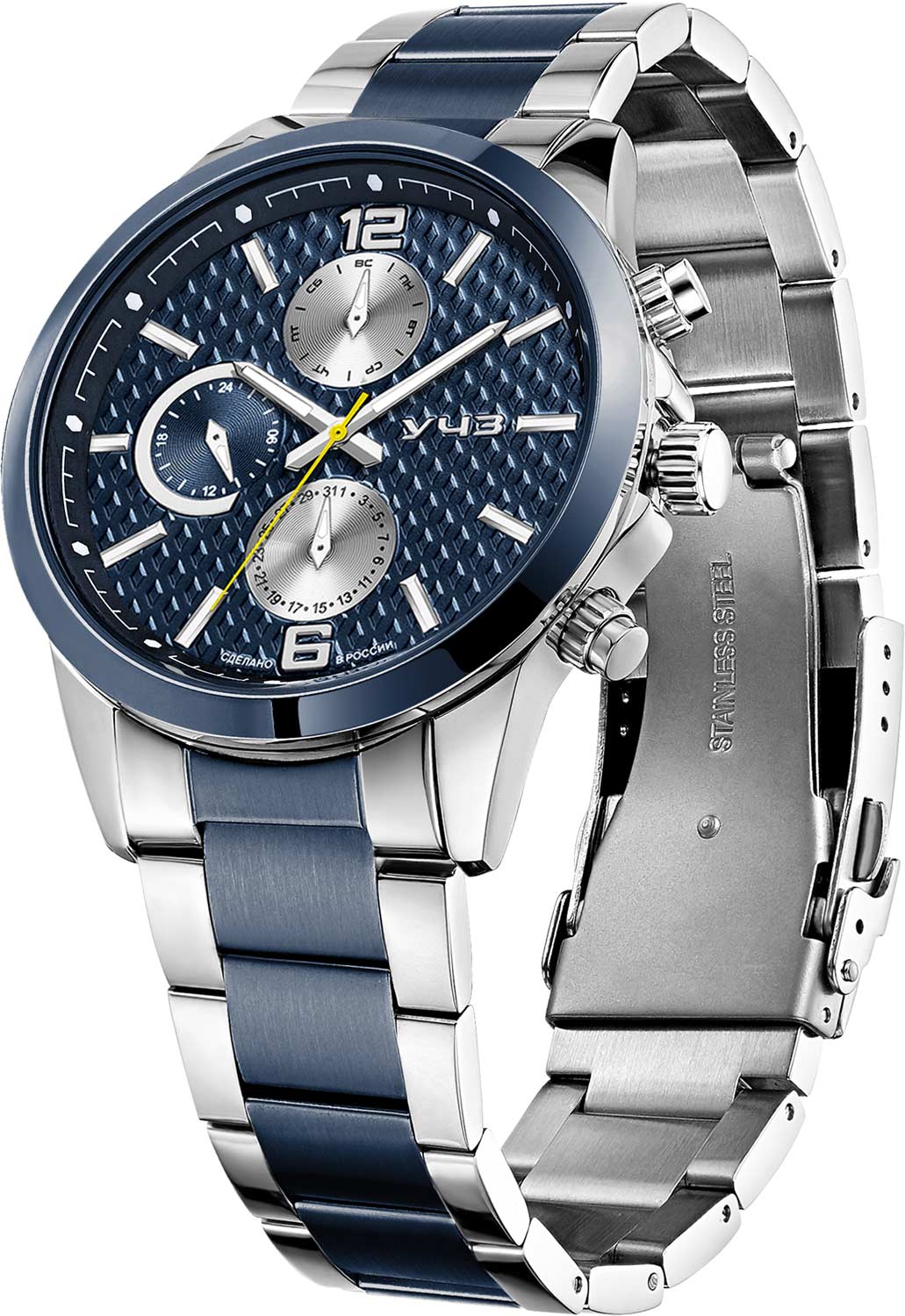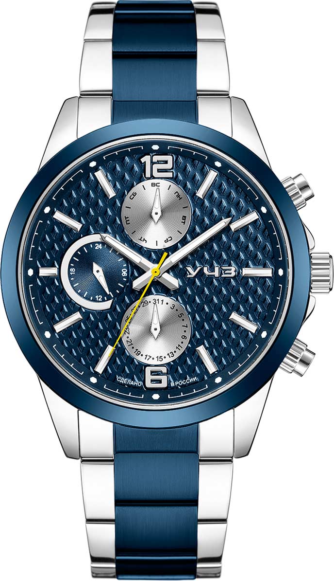 Время в 24-х часовом формате, дата и день недели вынесены на отдельные циферблаты. Рифленая заводная головка с защитой. Браслет с раскладывающейся застежкой.