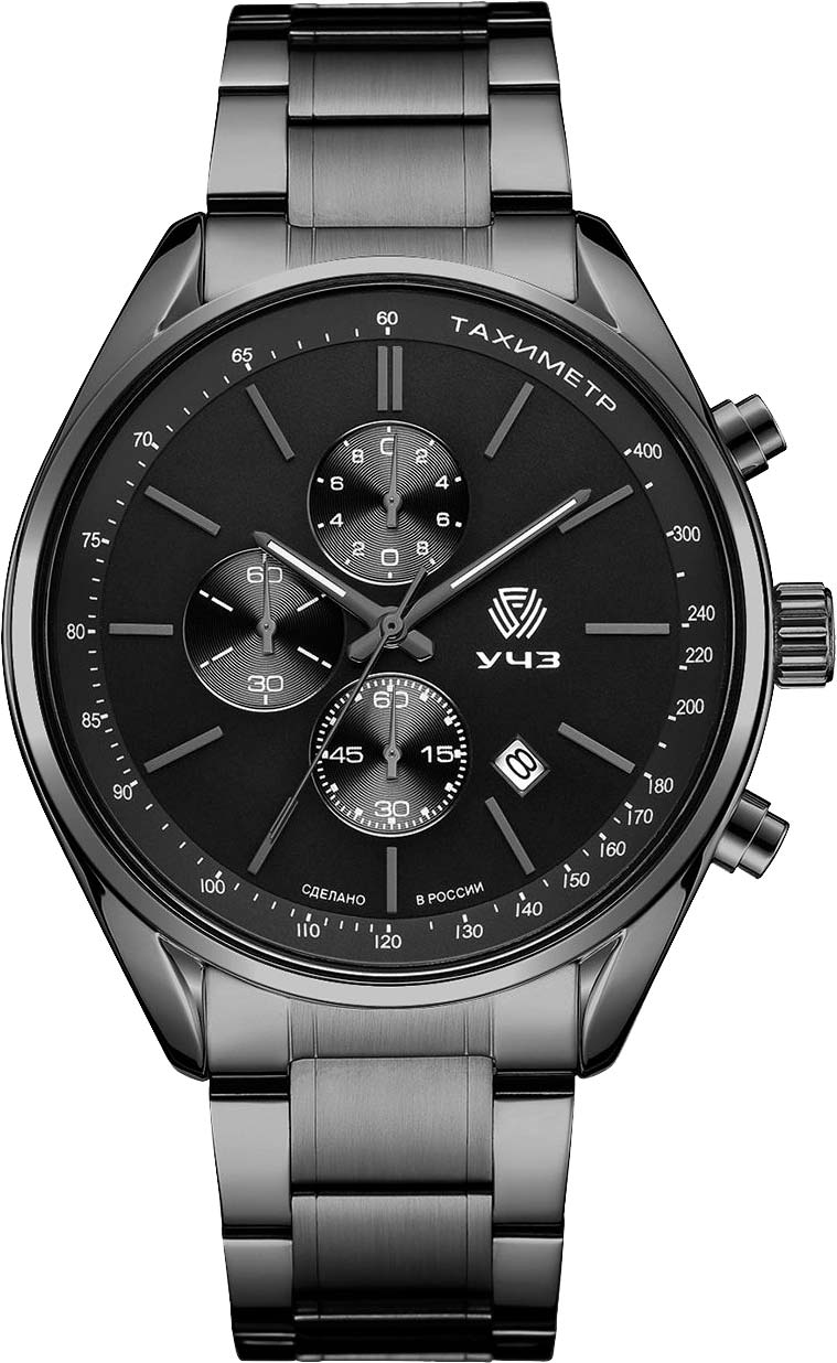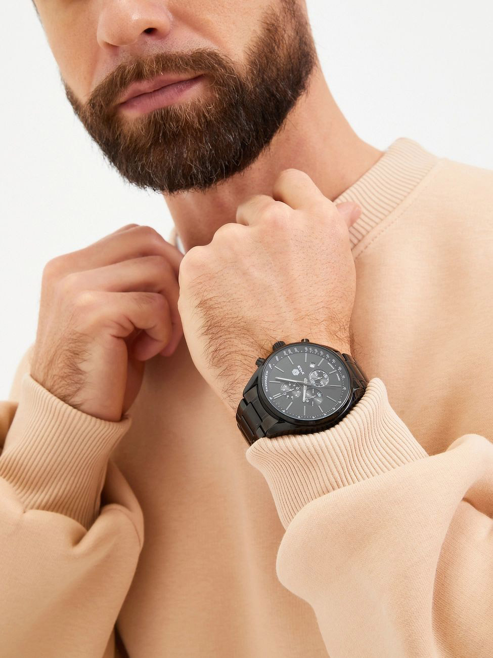 Спортивный хронограф с японским механизмом по достоинству оценят стильные и уверенные в себе мужчины. Мужские часы-хронограф с секундомером и тахиметром. Круглый стальной корпус с черным IP покрытием. Циферблат с метками в виде штрихов защищен минеральным закаленным стеклом. Люминесцентные стрелки. Окошко даты находится в положении между отметками 4 и 5 часов. Рифленая заводная головка. Стальной браслет с черным IP покрытием и застежкой-бабочкой.