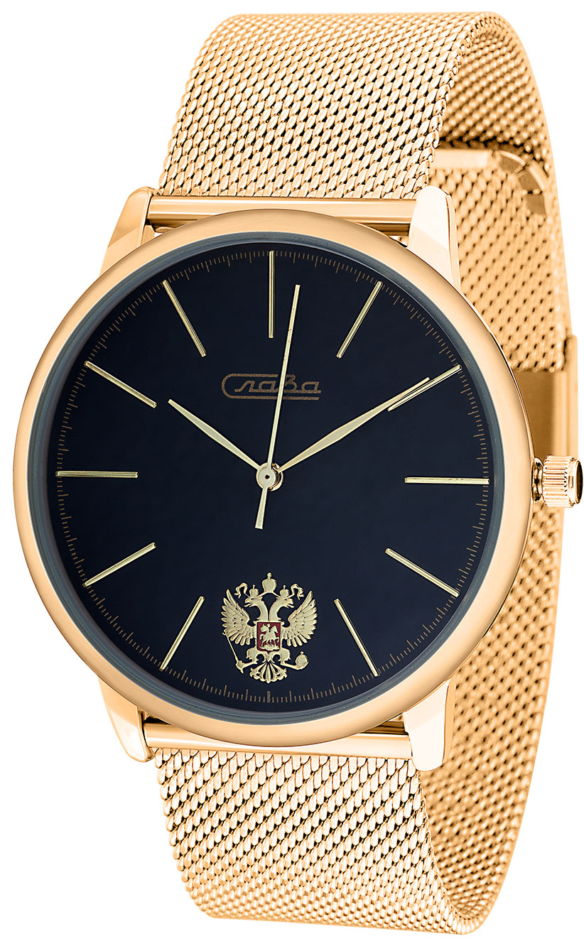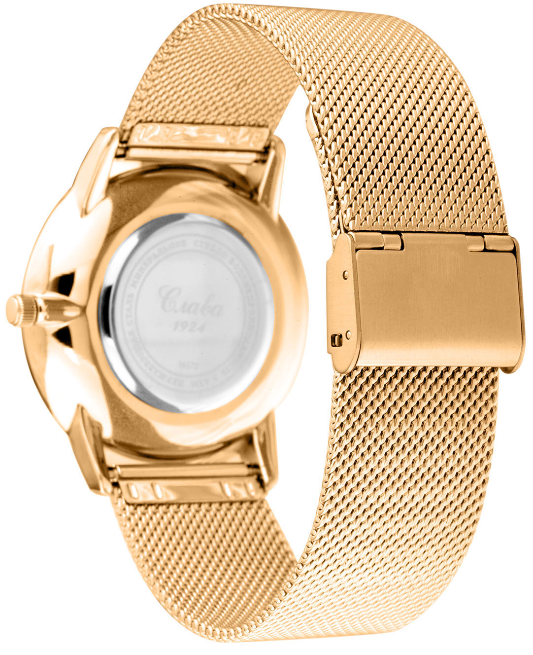 Популярные мужские отечественные часы в золотом стиле без чрезмерной вычурности. Традиция. Круглый корпус с задней крышкой из нержавеющей стали. Браслет миланского плетения.