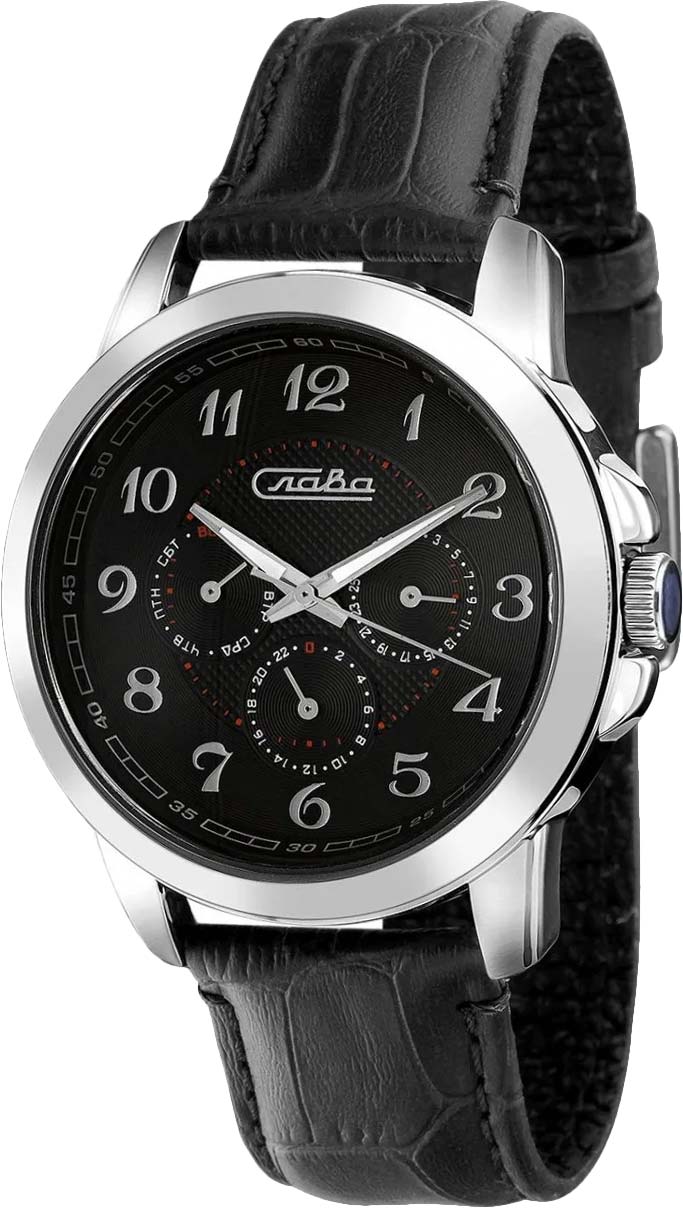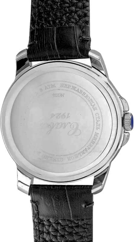 Традиция. Метки в виде арабских цифр. Число и день недели отображаются на отдельных циферблатах. 12-ти и 24-х часовой формат времени. Заводная головка с защитой. Кожаный ремешок с классической застежкой.