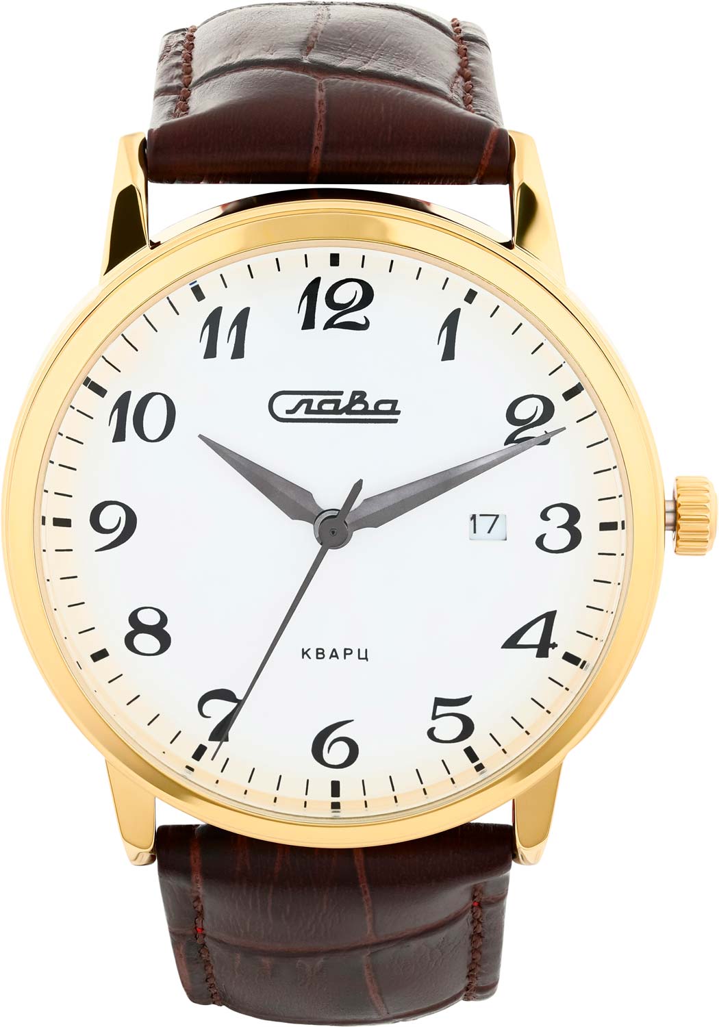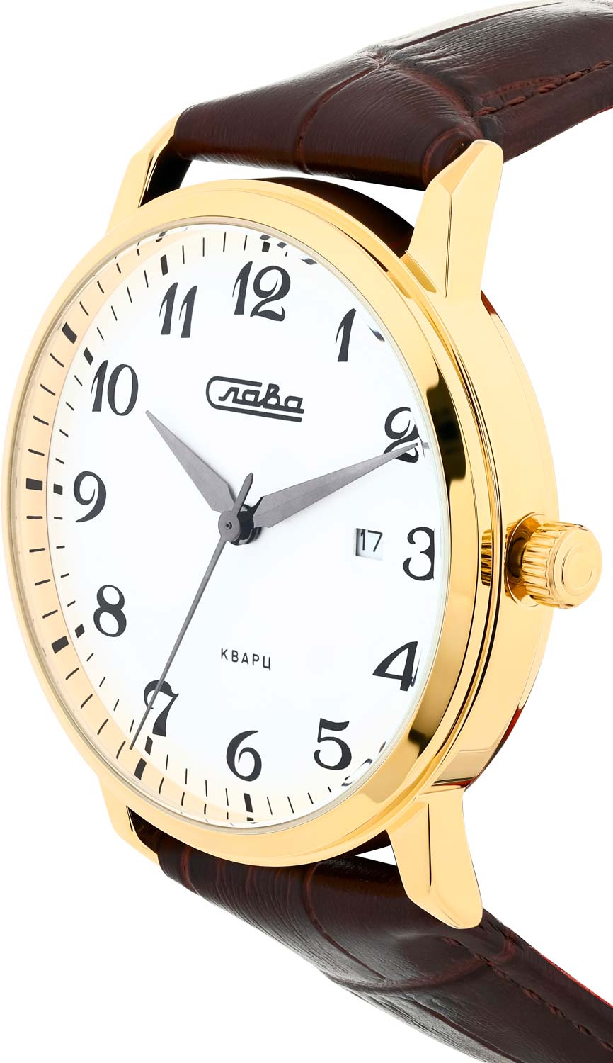 Традиция. Мужские наручные часы. Круглый латунный корпус. Циферблат с накладными метками в виде арабских цифр. Острые стрелки в стиле Alpha. Окошко даты находится на отметке 3 часа. Рифленая заводная головка. Задняя крышка из нержавеющей стали. Ремешок из натуральной кожи с классической застежкой.