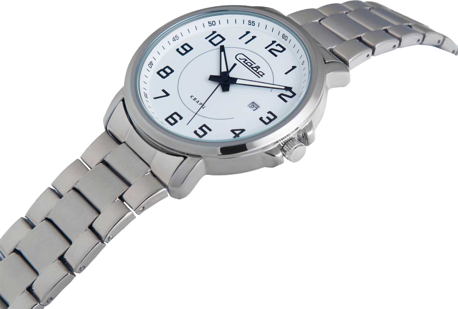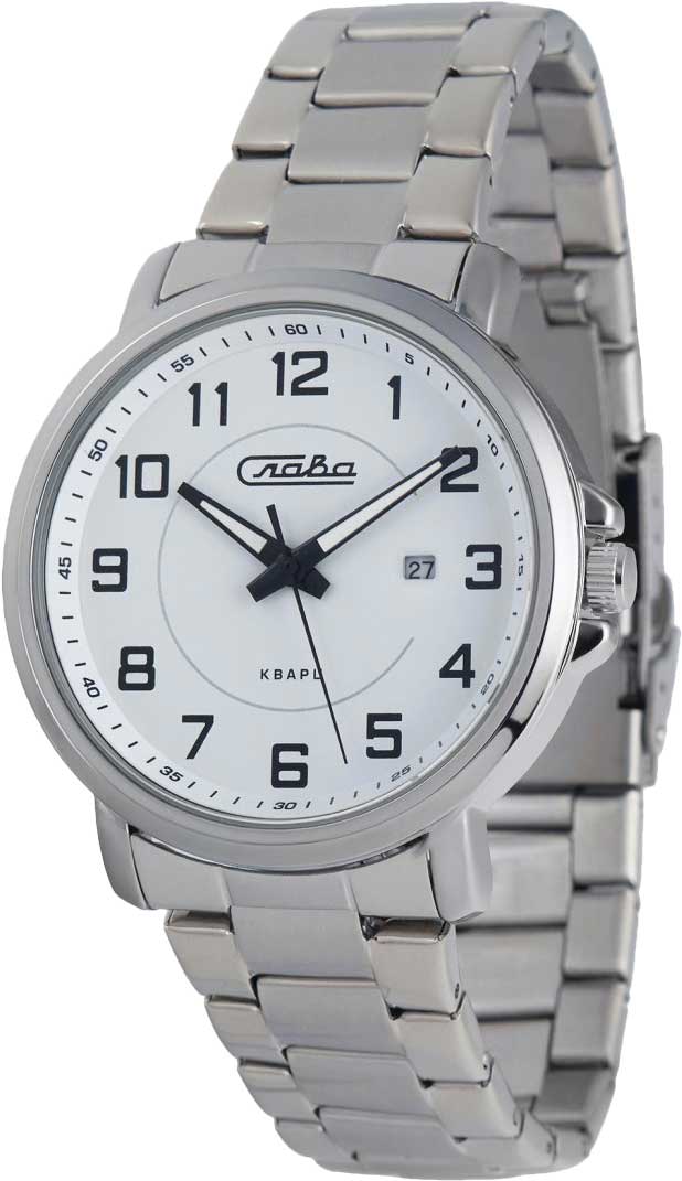 Мужские часы с круглым корпусом Традиция. Циферблат с метками в виде арабских цифр. Окошко даты находится в положении 3 часа. Заводная головка с защитой. Браслет с раскладывающейся застежкой. Застежка с системой блокировки.