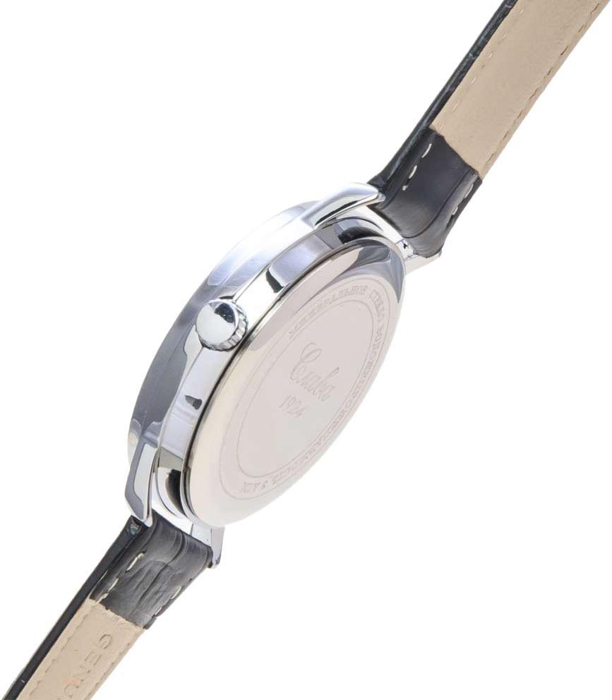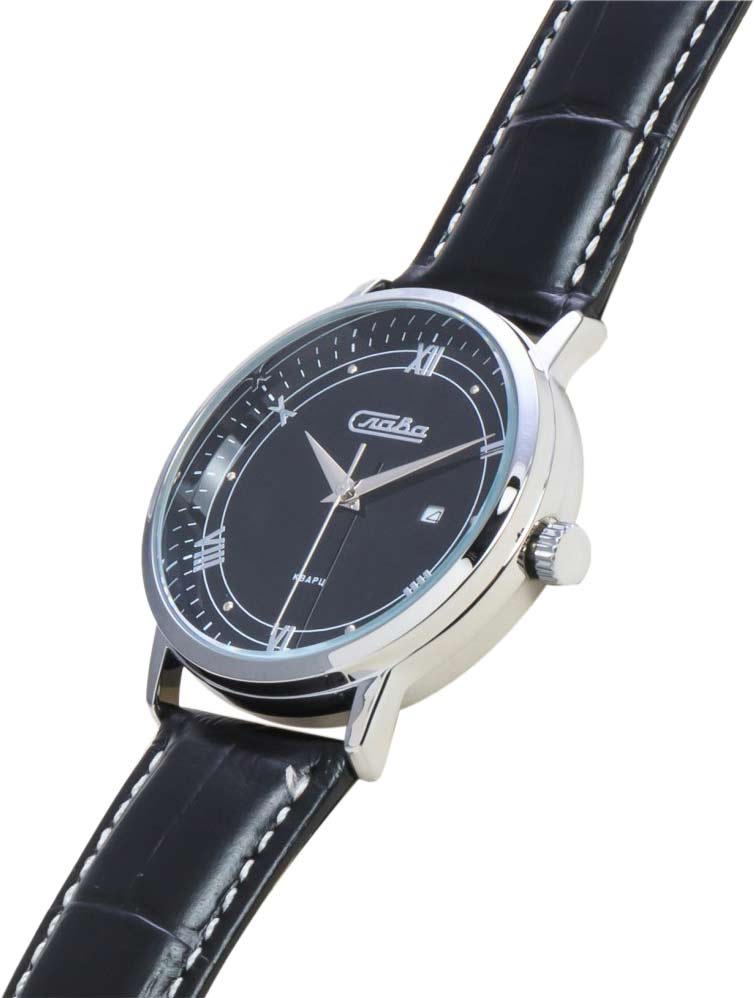 Мужские наручные часы с круглым корпусом. Циферблат защищен прочным минеральным стеклом с сапфировым покрытием. Метки в виде точек и римских цифр. Окошко даты находится в положении 3 часа. Рифленая заводная головка. Удобный кожаный ремешок с классической застежкой.